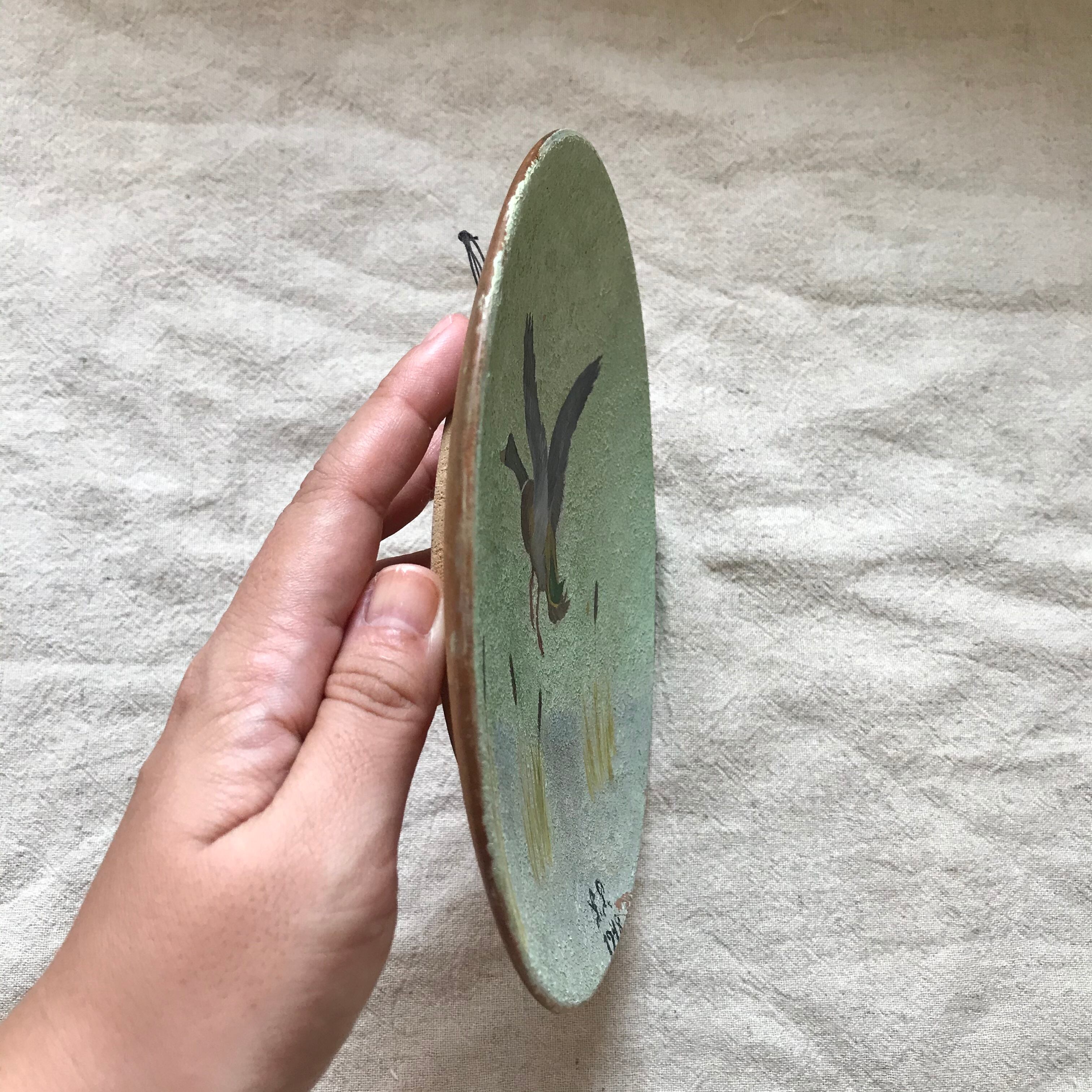スウェーデンで見つけた油絵で鳥がいる風景が描かれている木の飾り皿です。