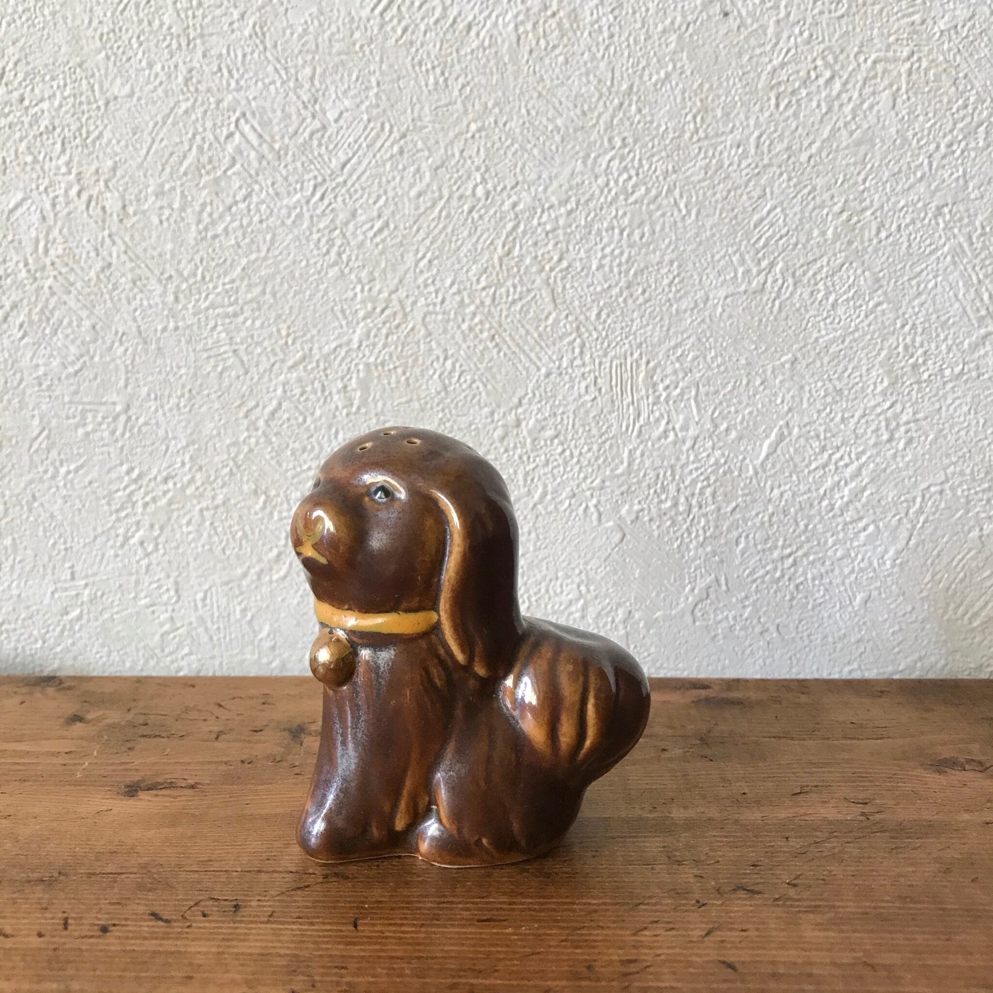 茶色い体に黄色い首輪に金の鈴のようなものが付いた犬は、中に塩や胡椒をいれ頭の穴から出す、ソルトケースとしても使えます。