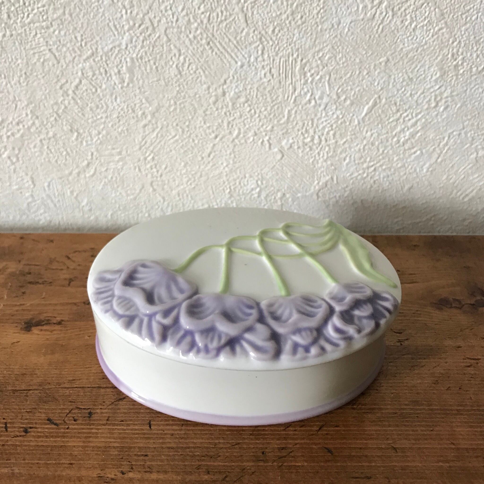 白い陶器に少しの立体感と淡い色味で花たちが表されています。