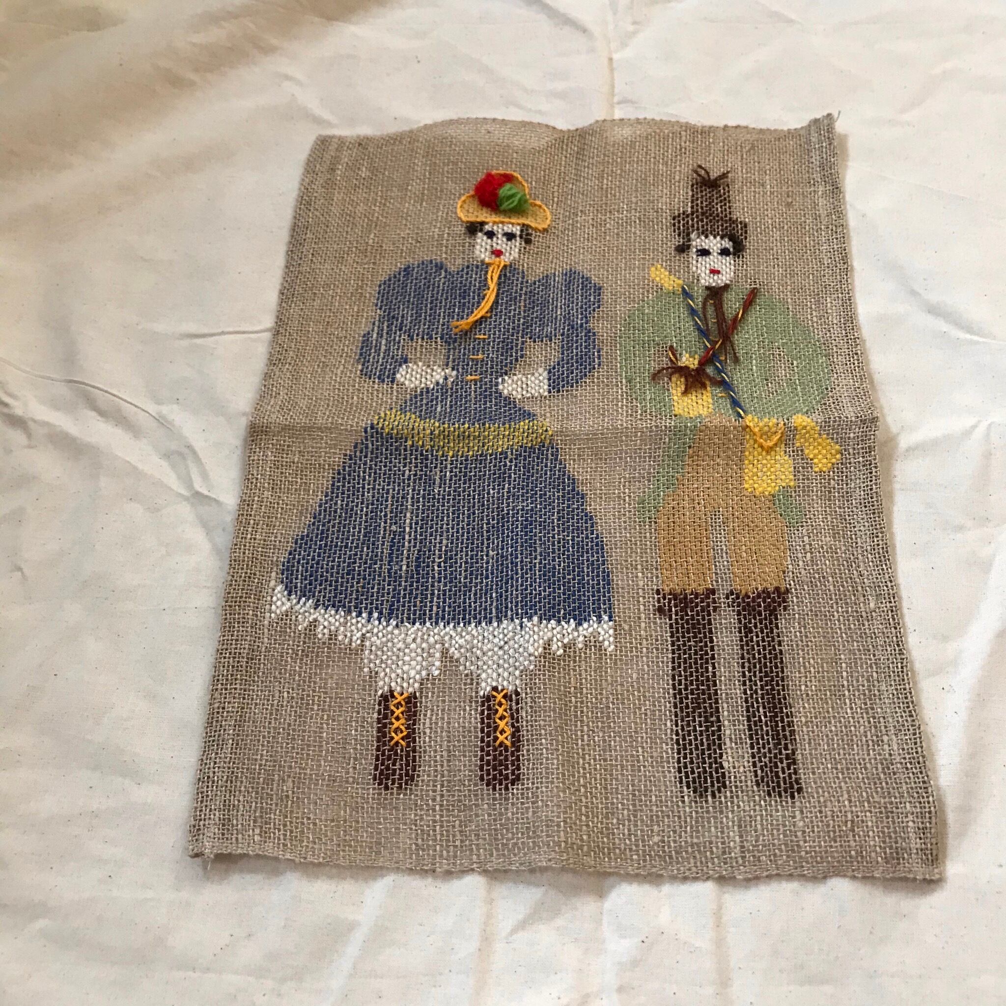 麻のようなザラついた布に刺繍などでシュールな2人組が描かれています。