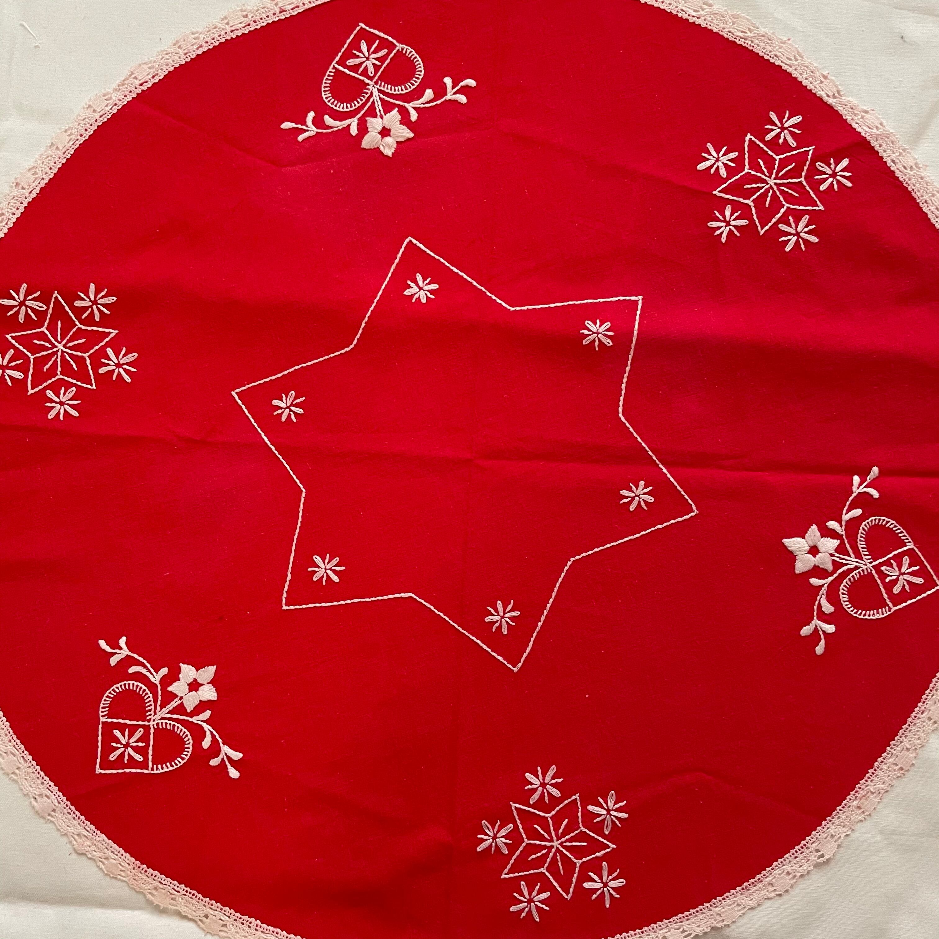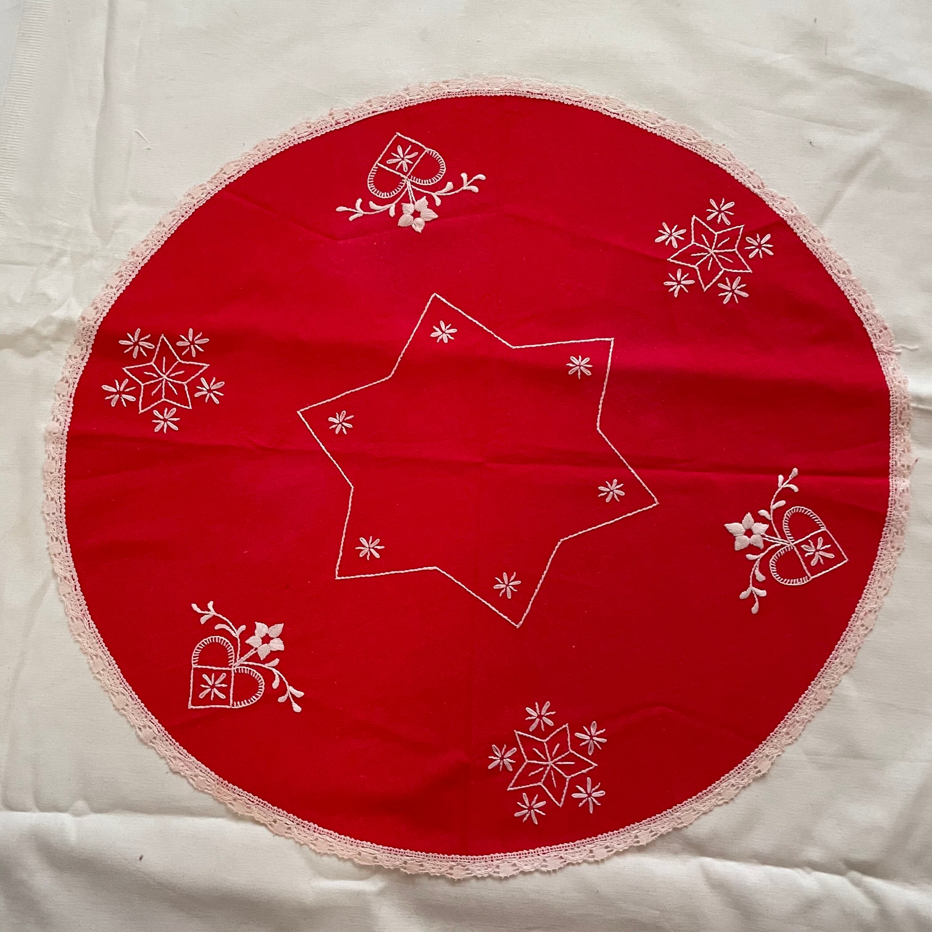 赤い丸い布にハートや星モチーフが刺繍されています。