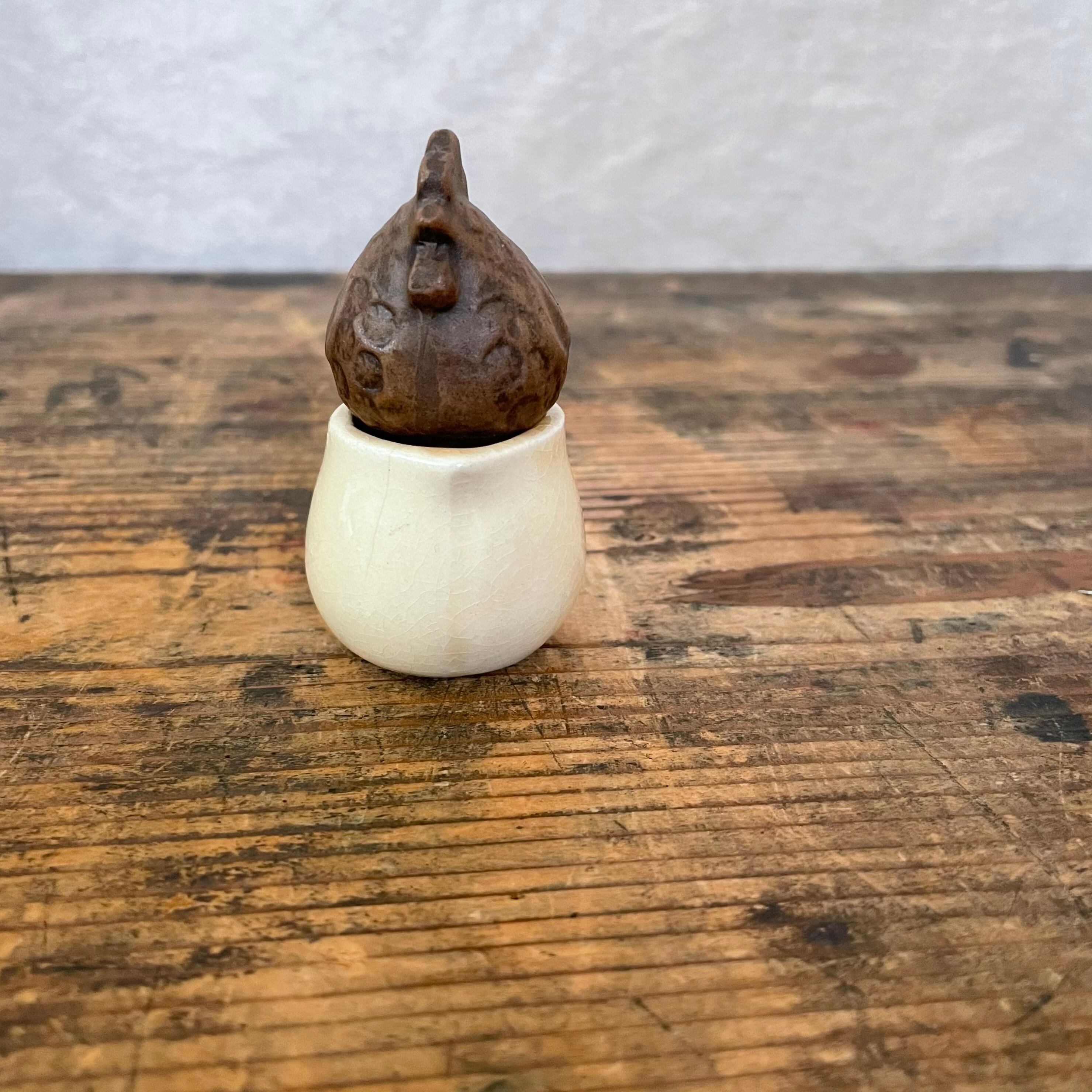 ミニチュアのピッチャーの上にニワトリを置いたらうまくハマったのでセットにしました。