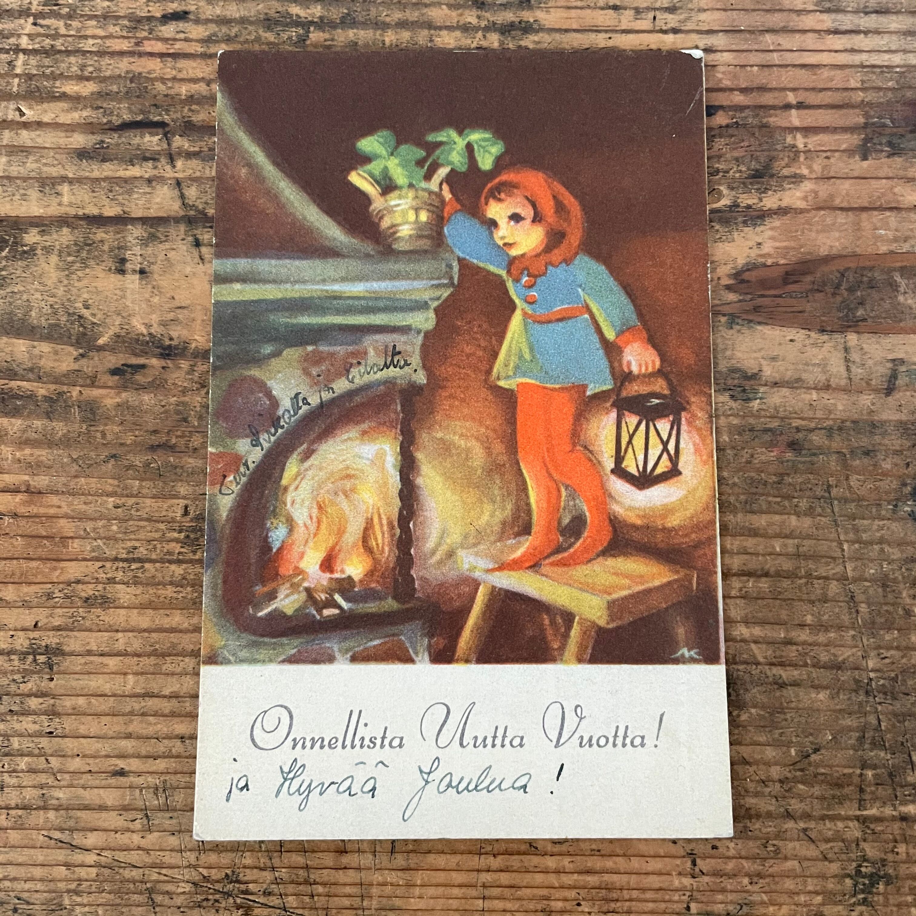 絵葉書とトムテのオーナメントと藁編みの置物です。