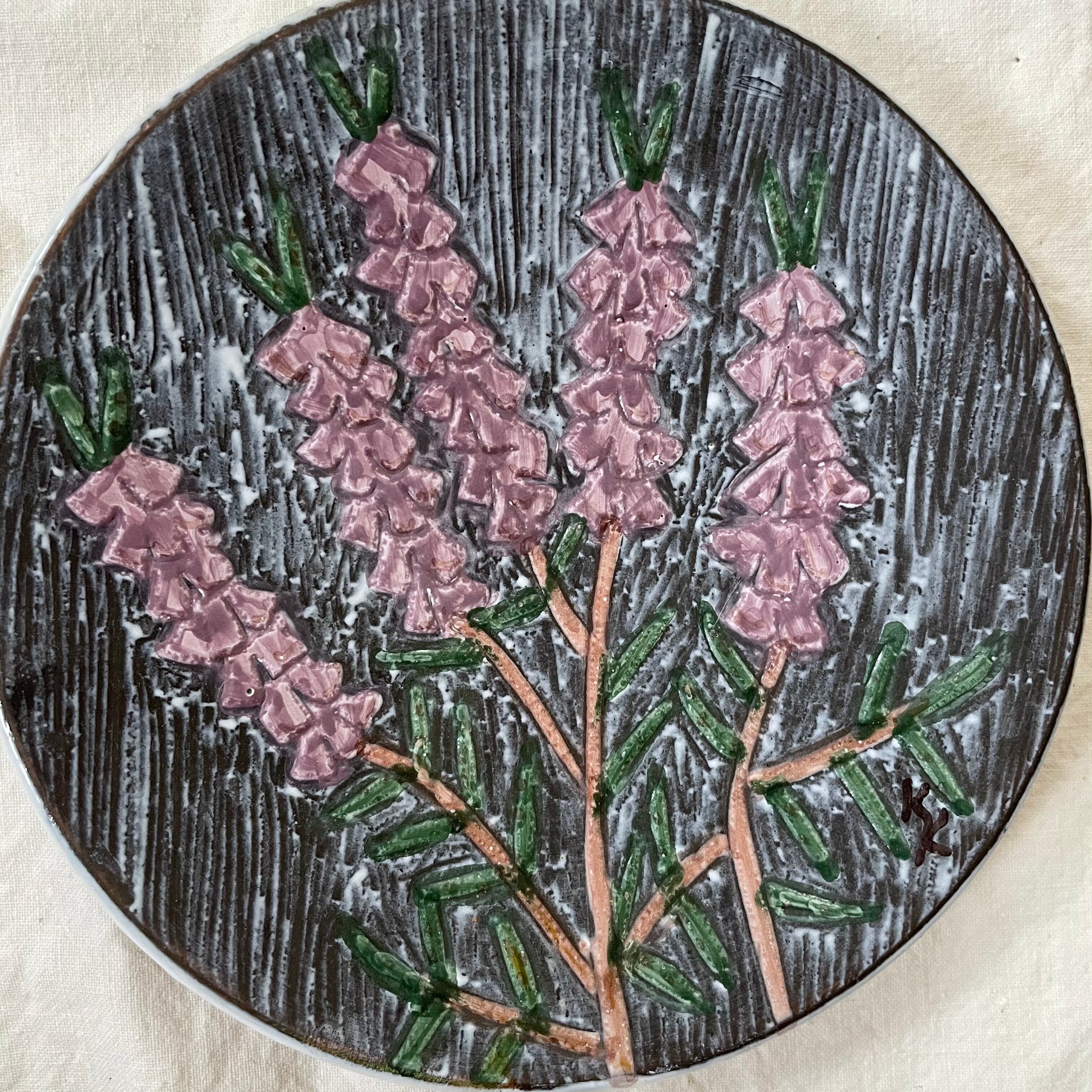 黒っぽい背景に立体的に紫色の花が表現されています。