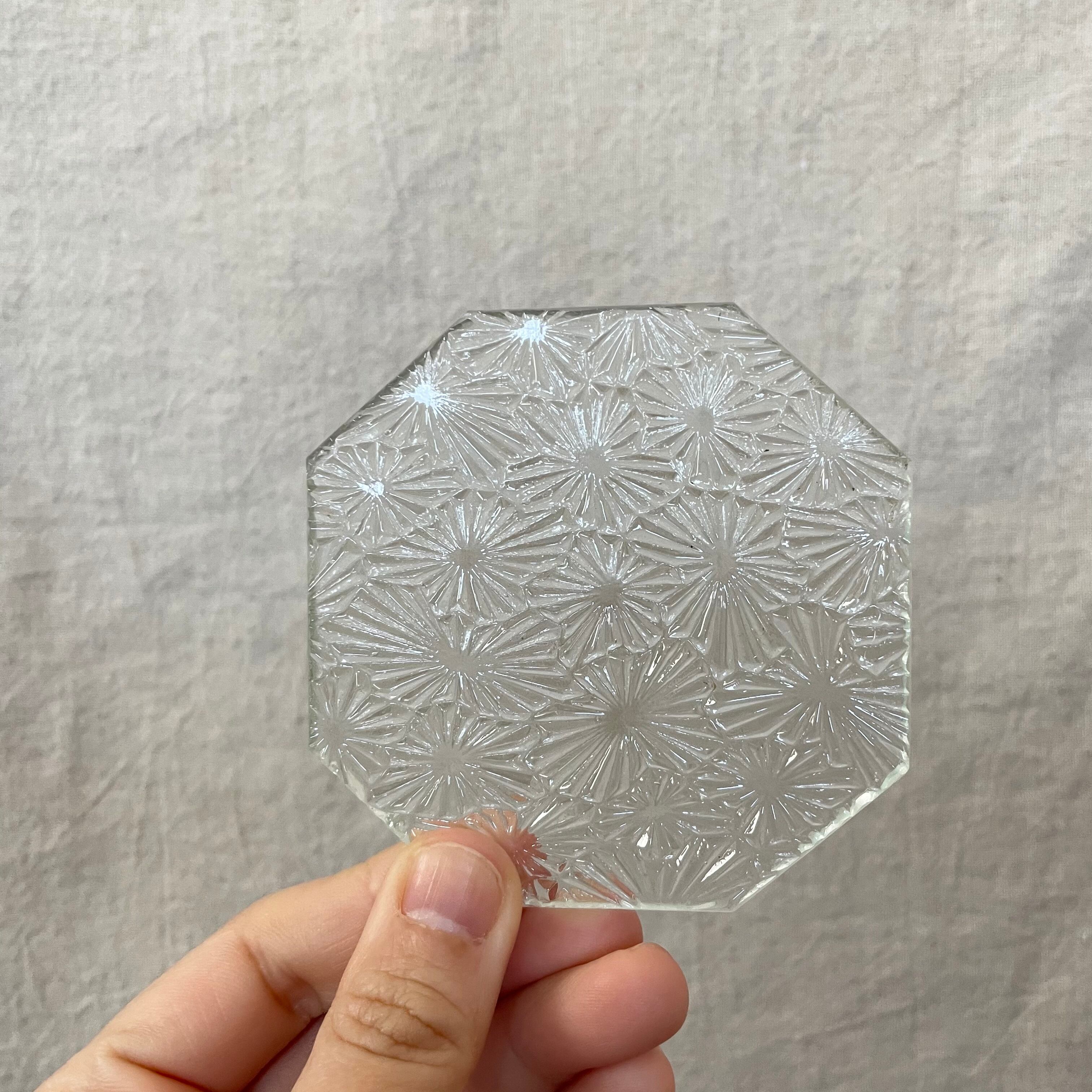 八角形のガラスの板の片面に、立体的に花のような模様が表現されています。