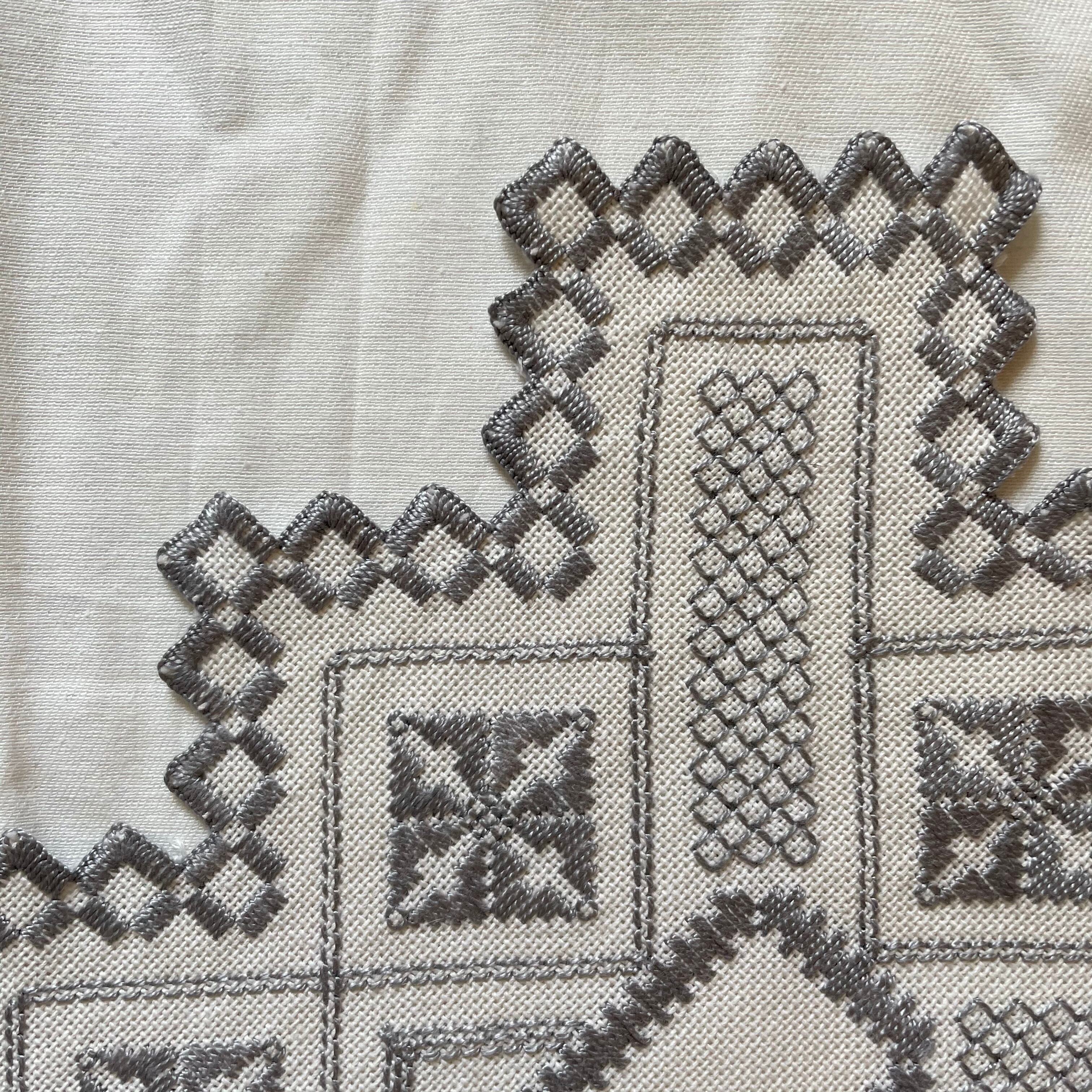 少し硬めの白い生地に光沢のあるグレーの糸で細かい刺繍が施されています。