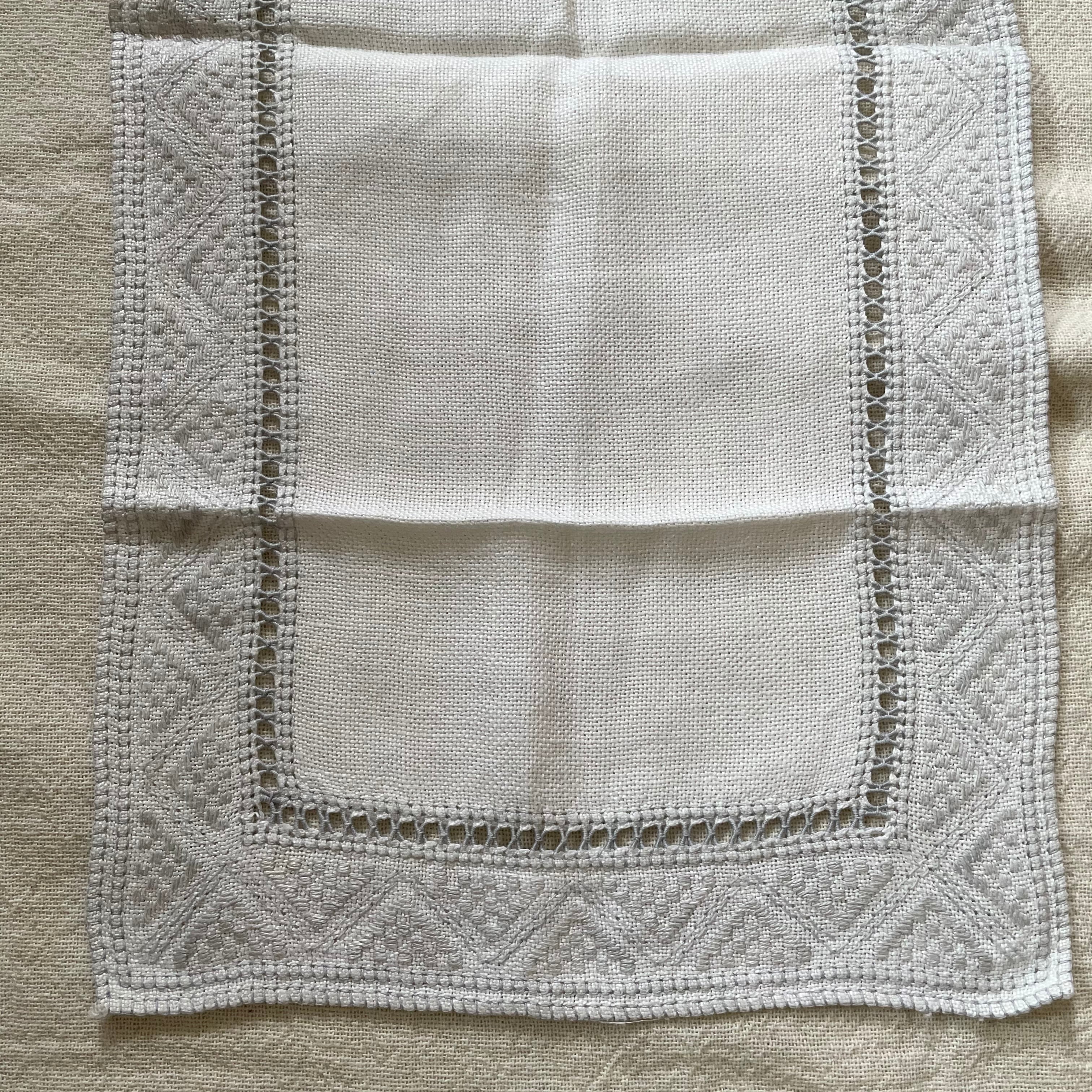 スウェーデンで見つけた白地に淡いグレーの刺繍布です。