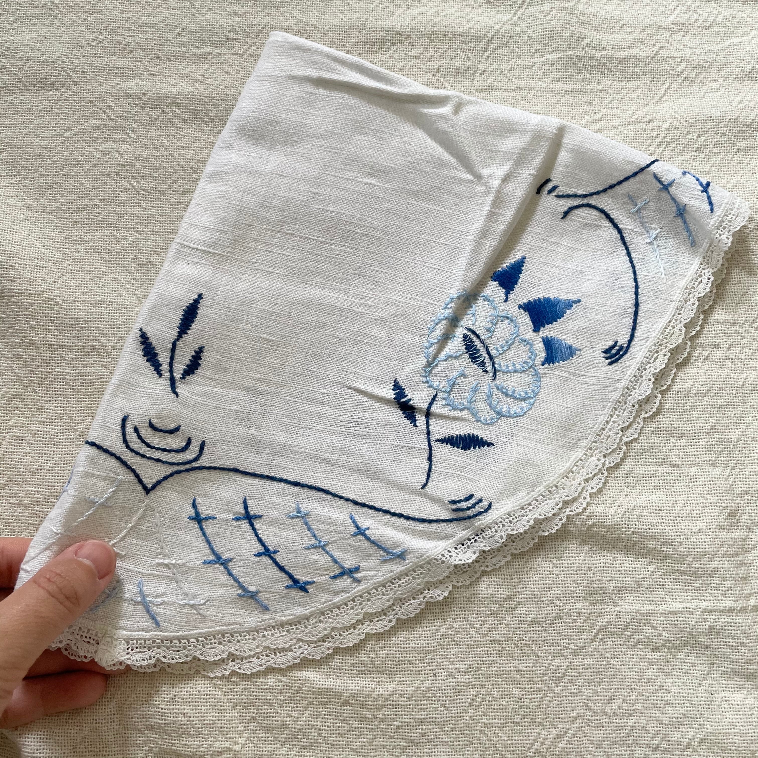 オーバル型の薄い白い布に、様々な青で花模様が丁寧に刺繍されています。