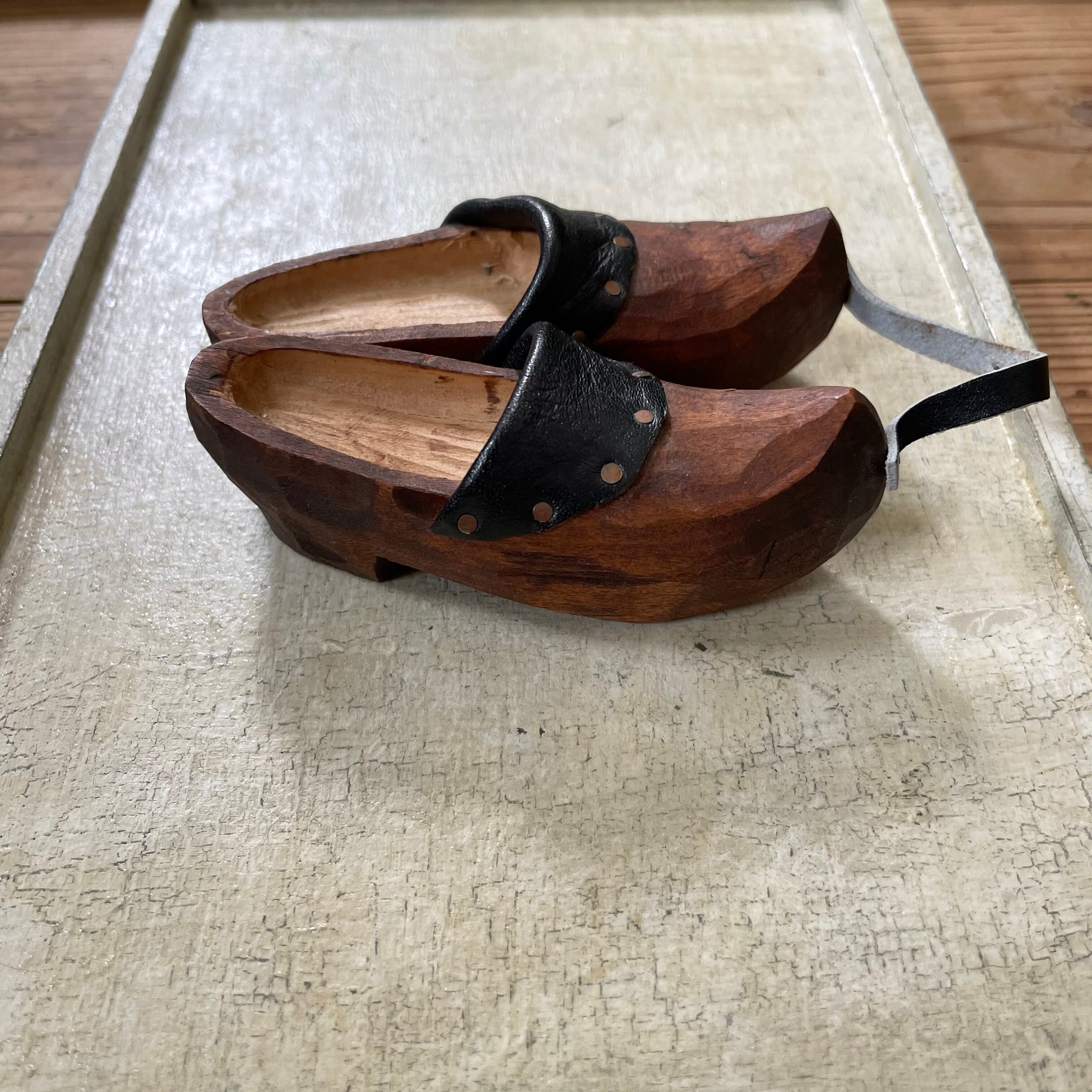 手彫り感のある木靴は落ち着いた色味に着色されていて、革とのバランスもよくて、壁にかけて飾りたくなります。