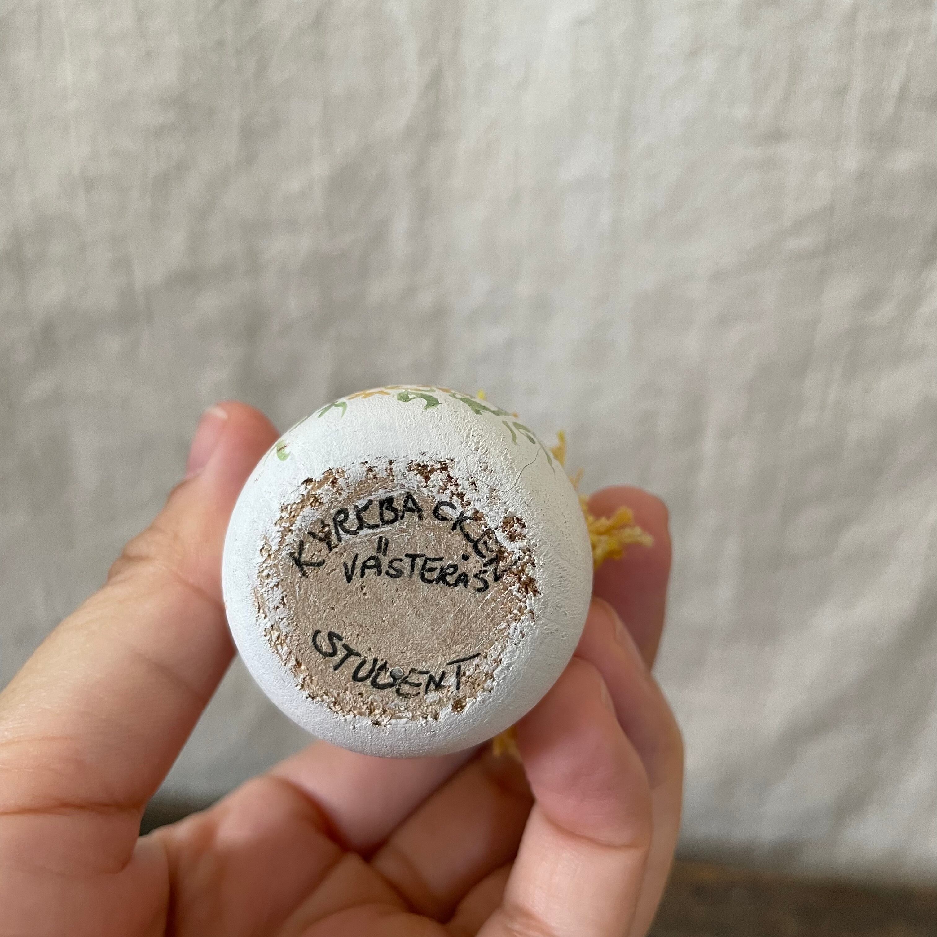 木製の女の子は、体は白地に花模様が描かれて、糸の髪に、フェルトの帽子をかぶっています。