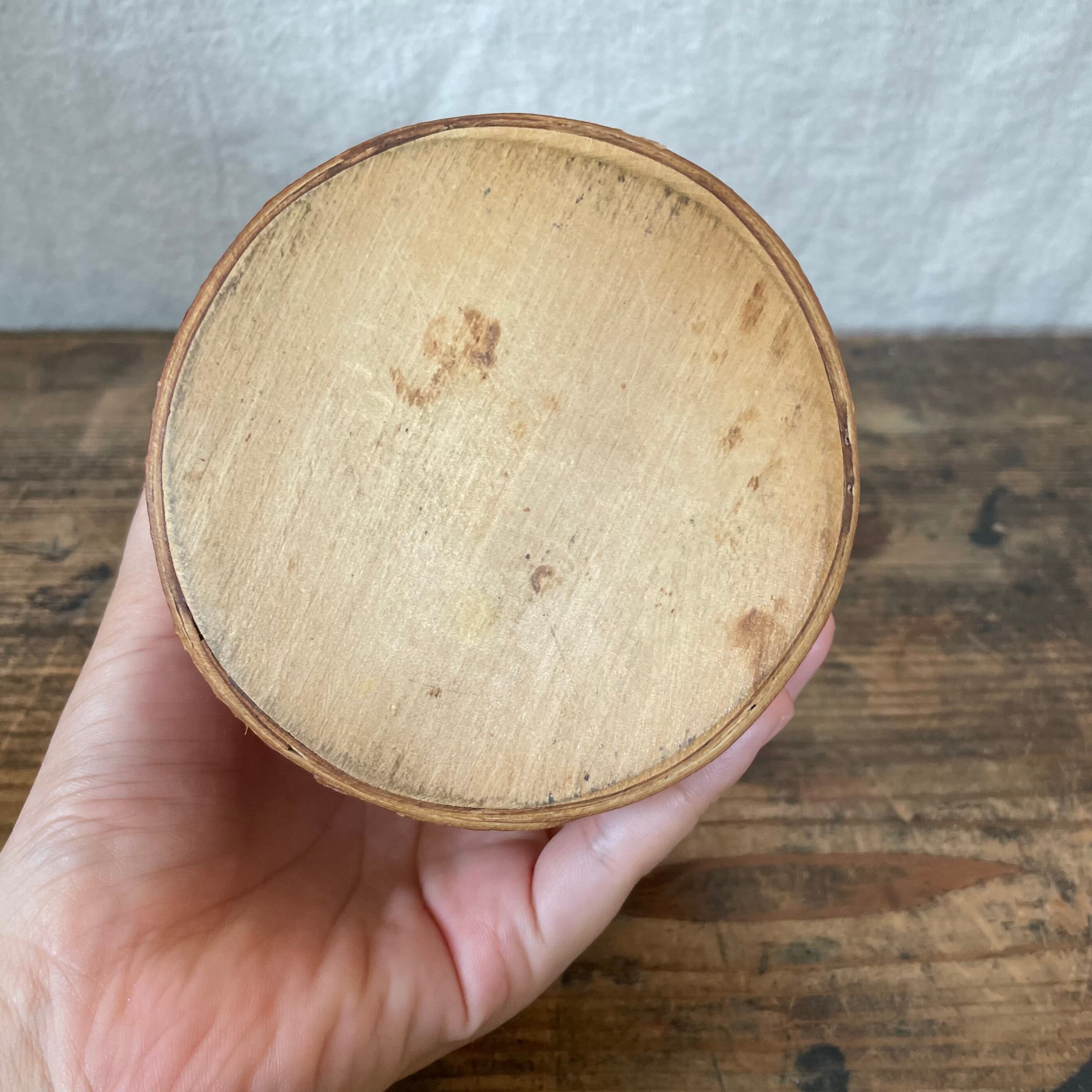 白樺の樹皮のもつ独特な優しい雰囲気、木の蓋に革?の取手と自然なものだけで作られているというところに伝統を感じます。