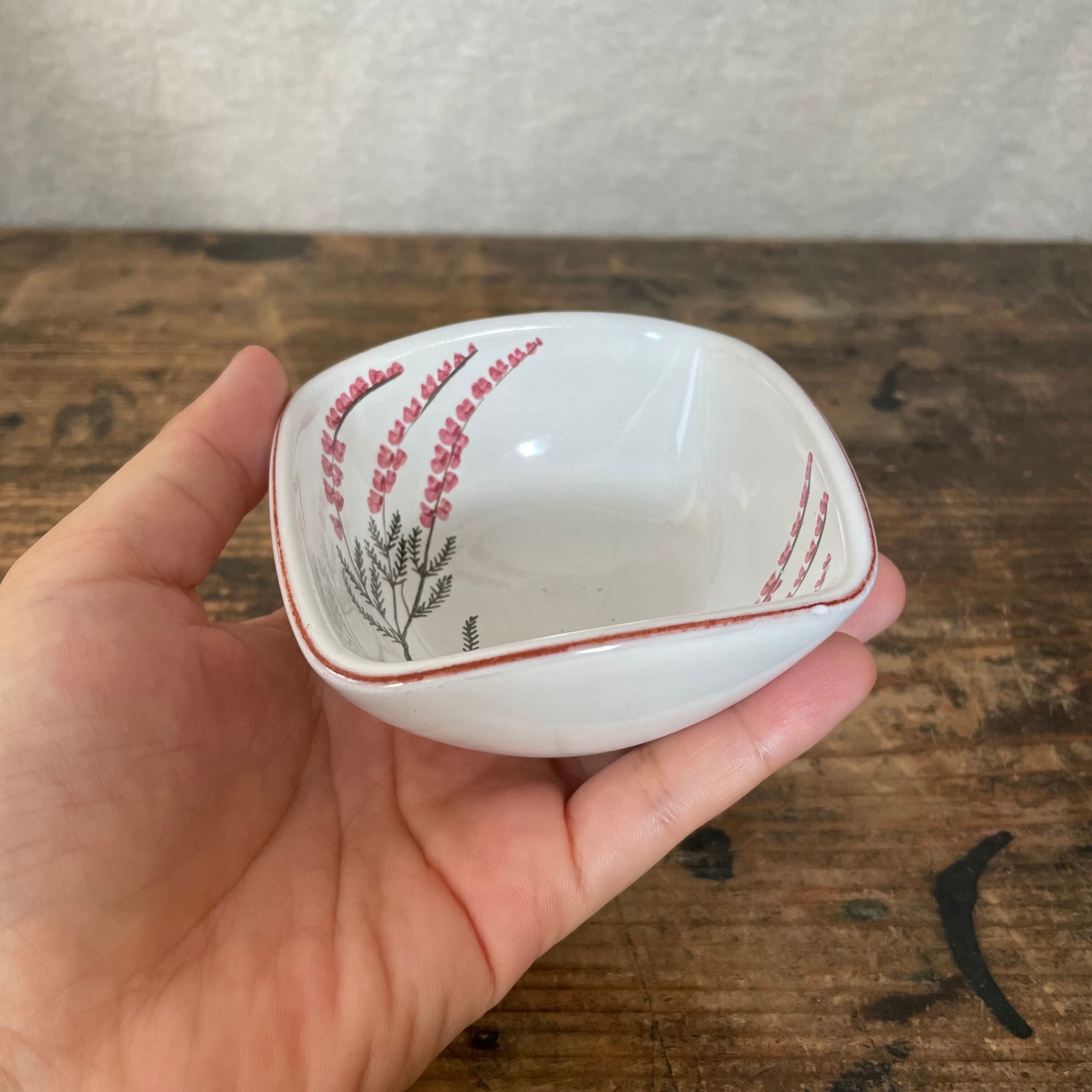 柔らかな四角の器は、中に手描きで花模様が描かれています。