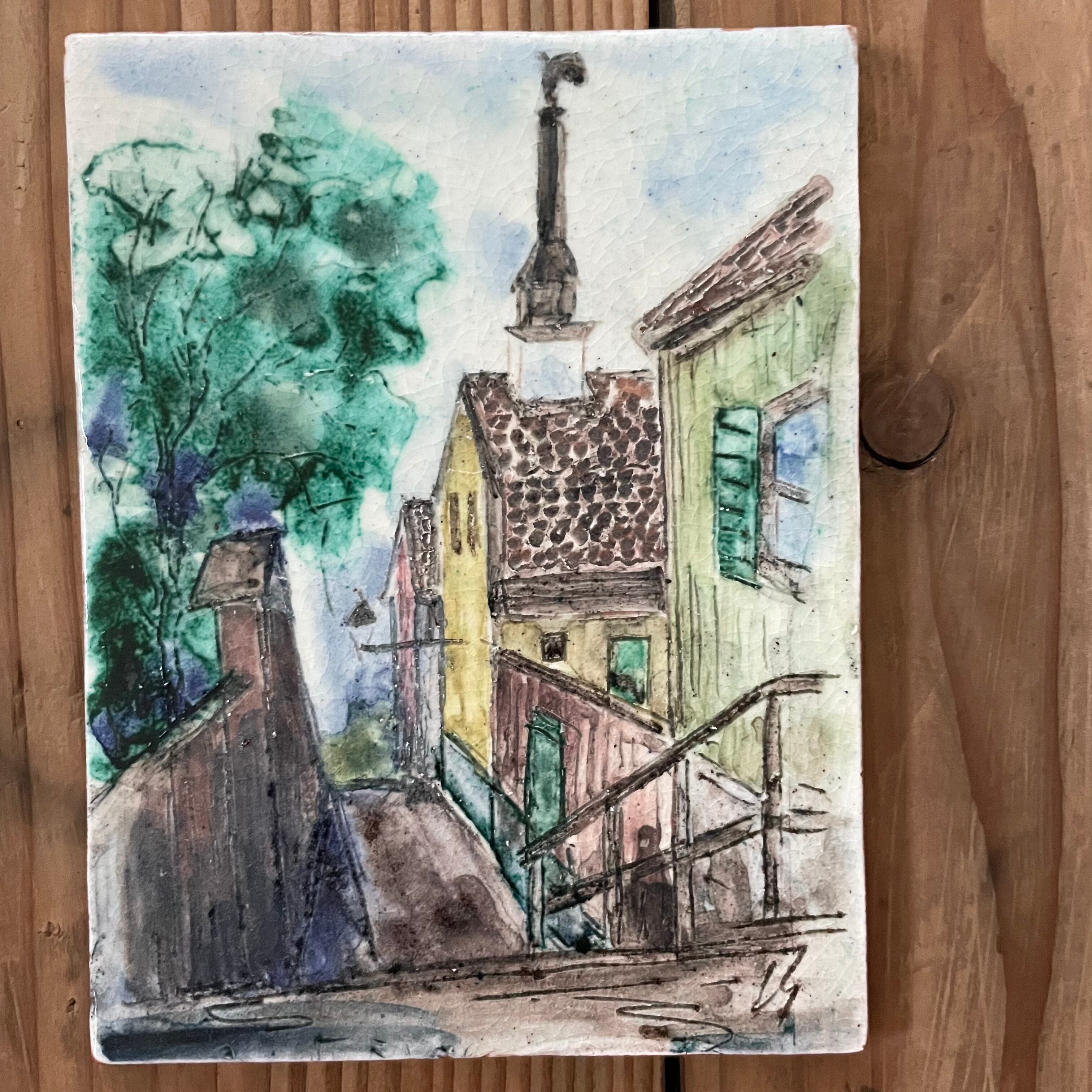 タイルのような陶板のような壁飾りは、水彩画のような色味と滲んだようなタッチが特徴的です。