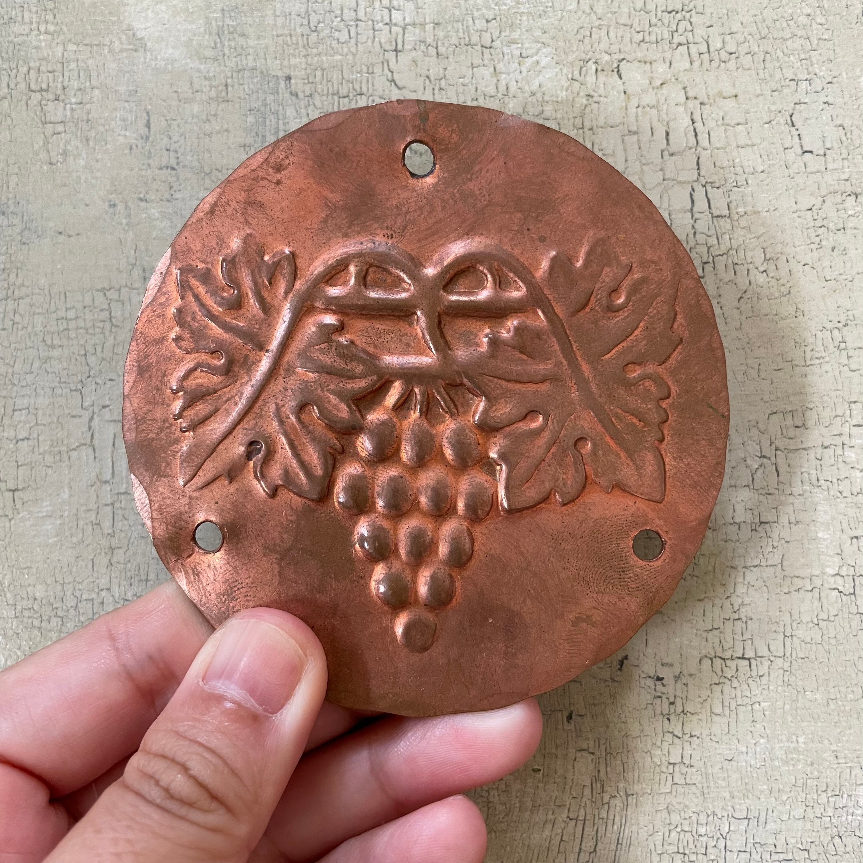 銅の板に凹凸でブドウの模様が表現された飾りです。