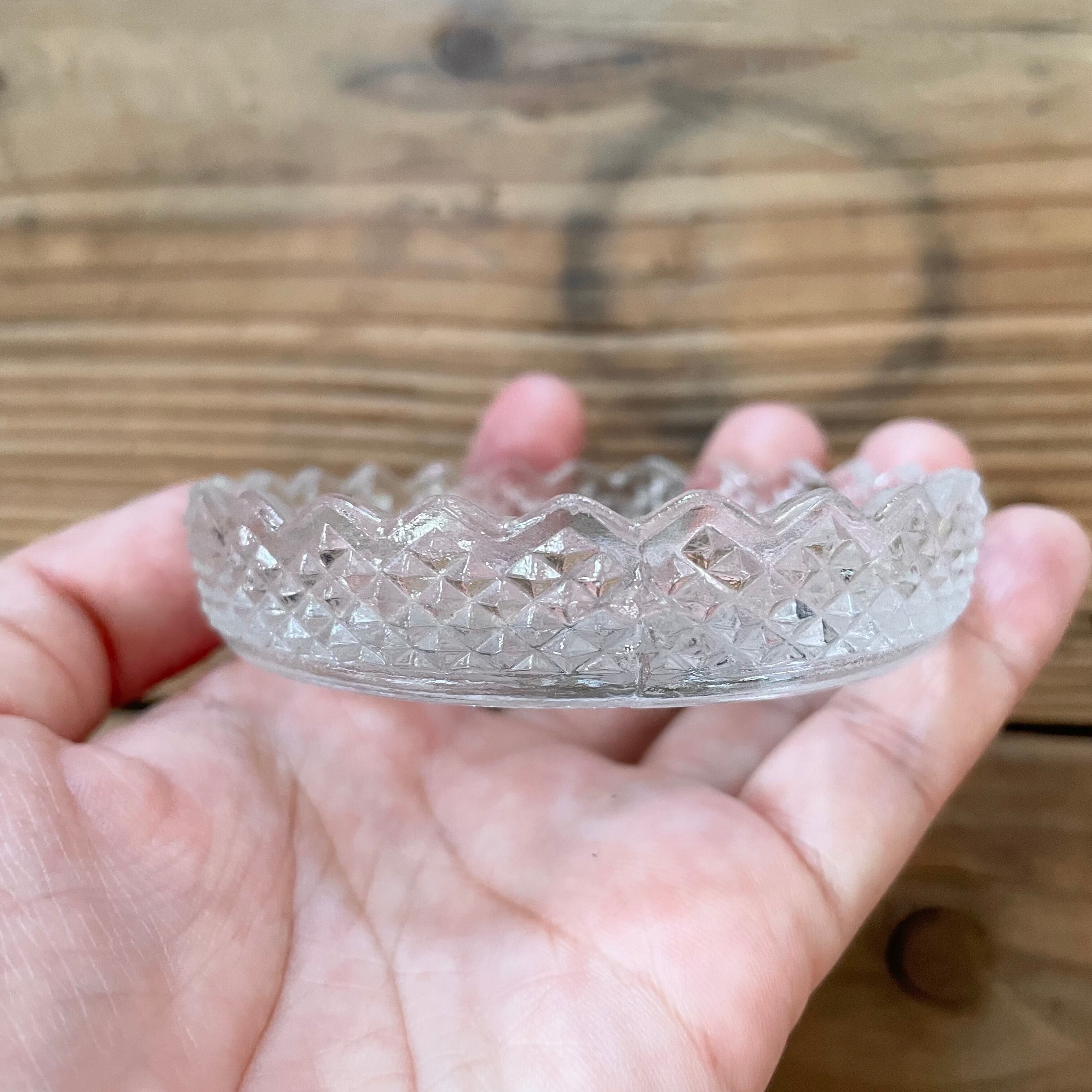 ガラスの小皿は底もフチも割としっかり模様入り、キーホルダーは真ん中にレースのフクロウが埋め込まれているシンプル仕様。
