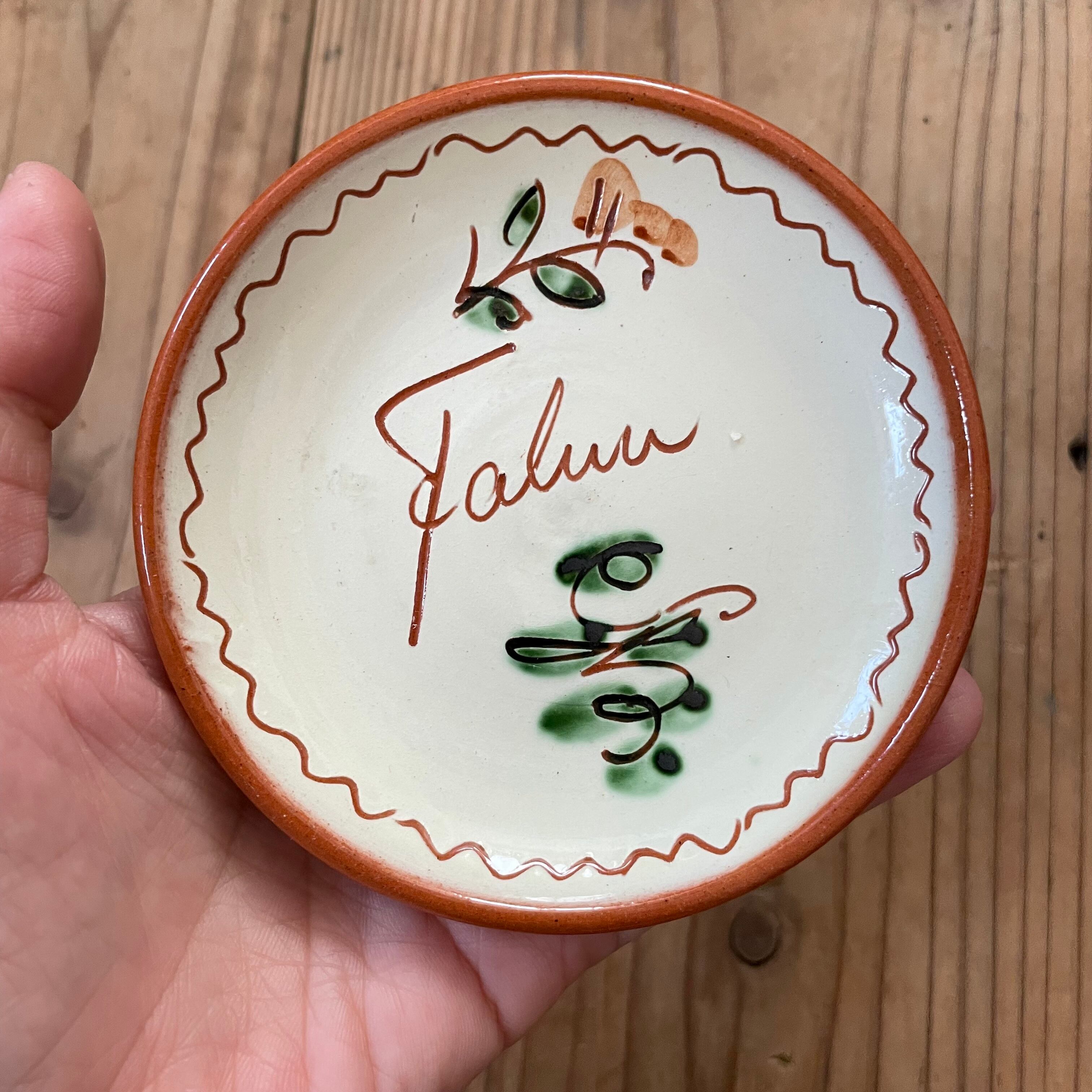 茶色いフチにクリーム色、ゆるい植物模様、falun(スウェーデンの都市名)、ツルッとした質感、絶妙なバランス感で、どこか懐かしくてほっこりします。