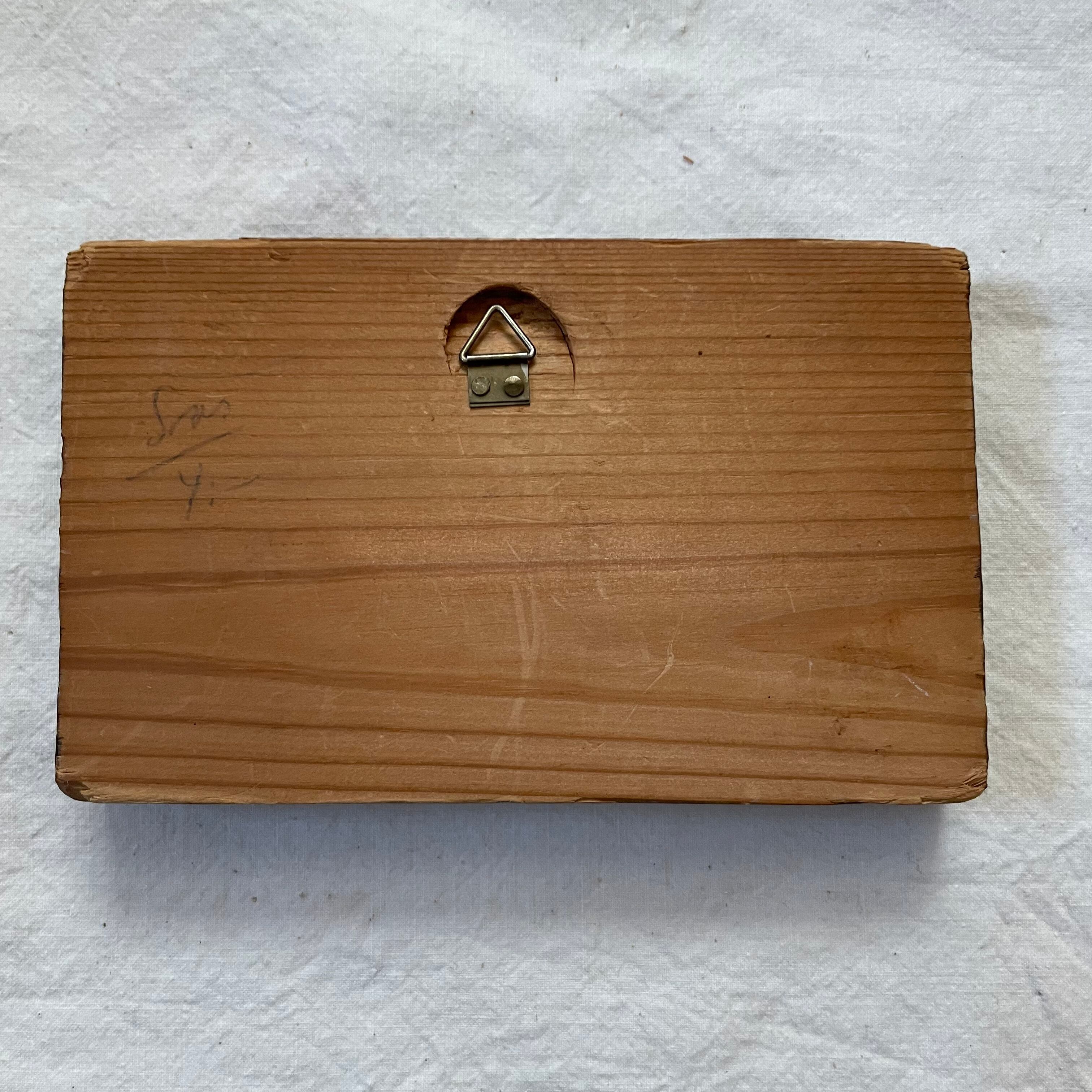 木を彫って少し立体的に建物のある風景が描かれています。