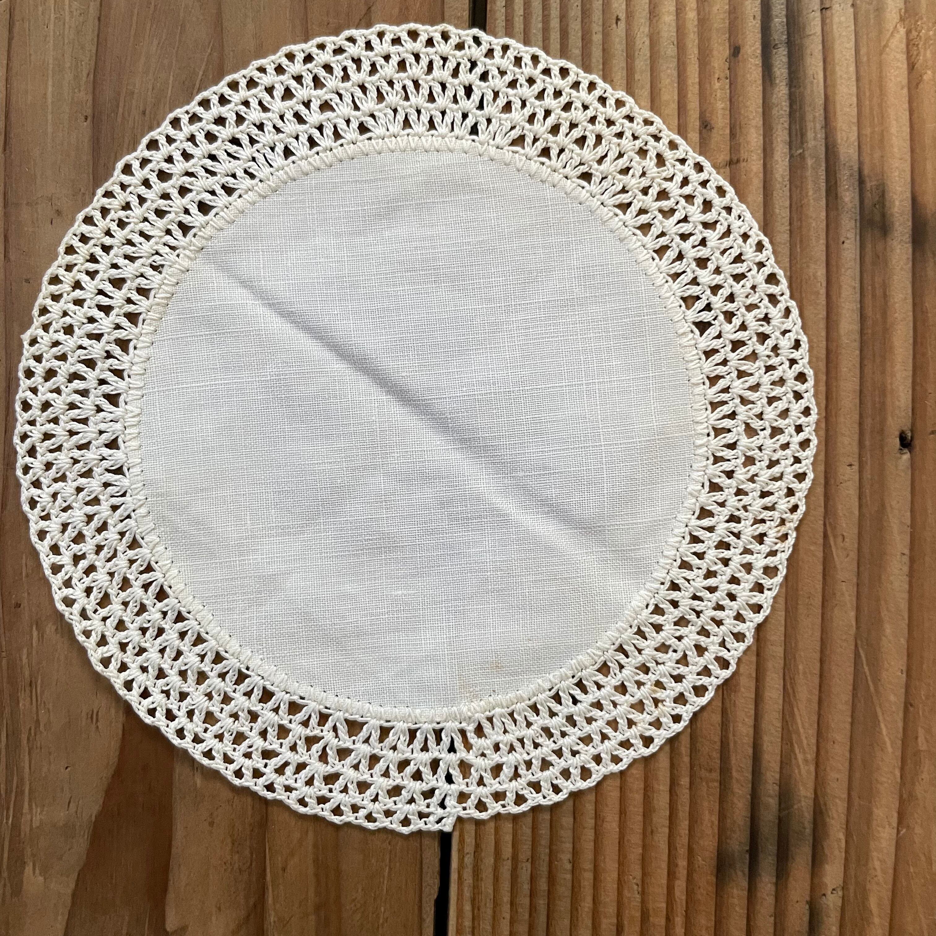 雪の結晶のような繊細な編み目が美しいものと、真ん中が布になっていてシンプルで使い勝手が良さそうなもののセットです。