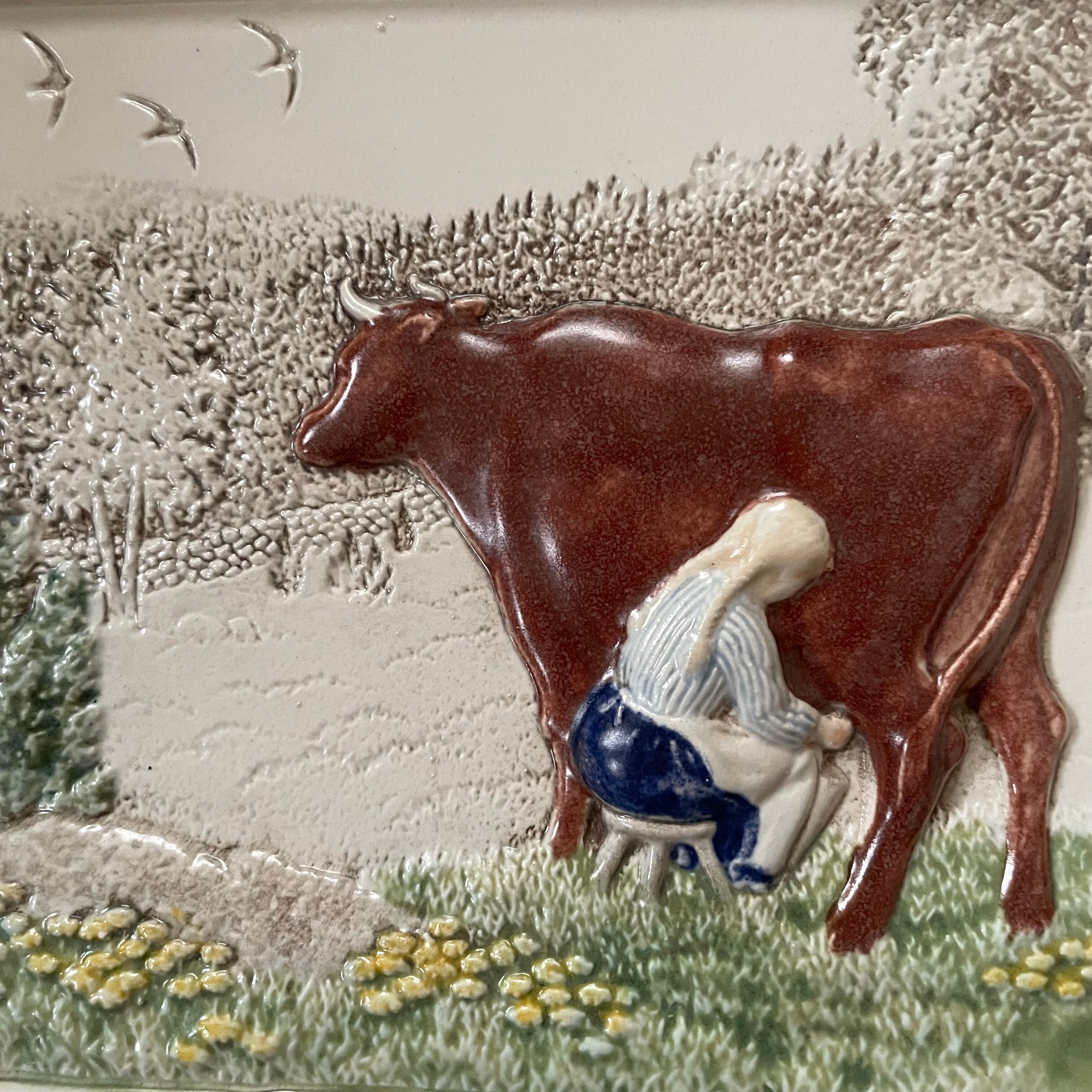 白地に立体的に牛と乳搾りをする女の子が表現されています。