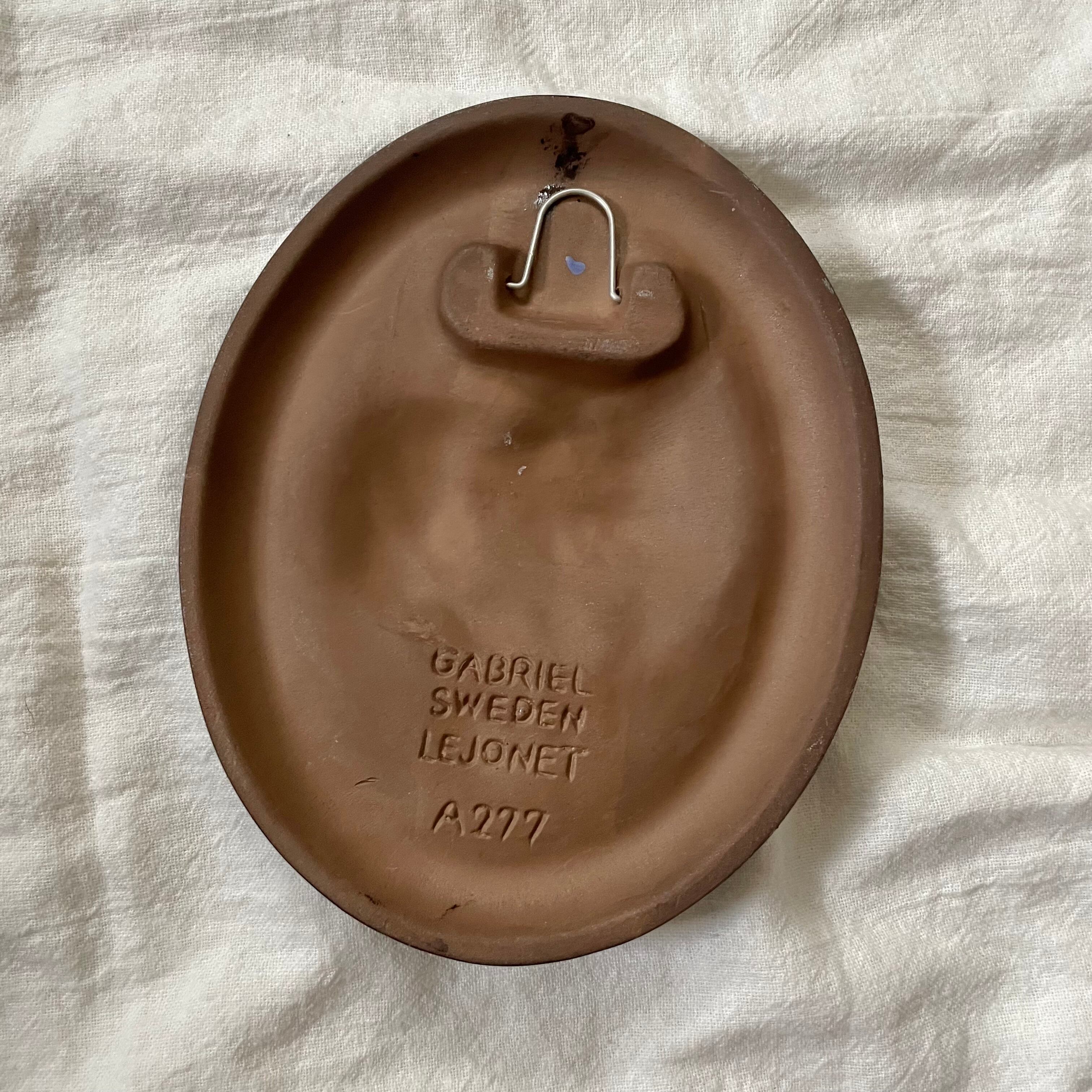 濃い茶色の円形のふちの中に立体的に獅子が描かれています。