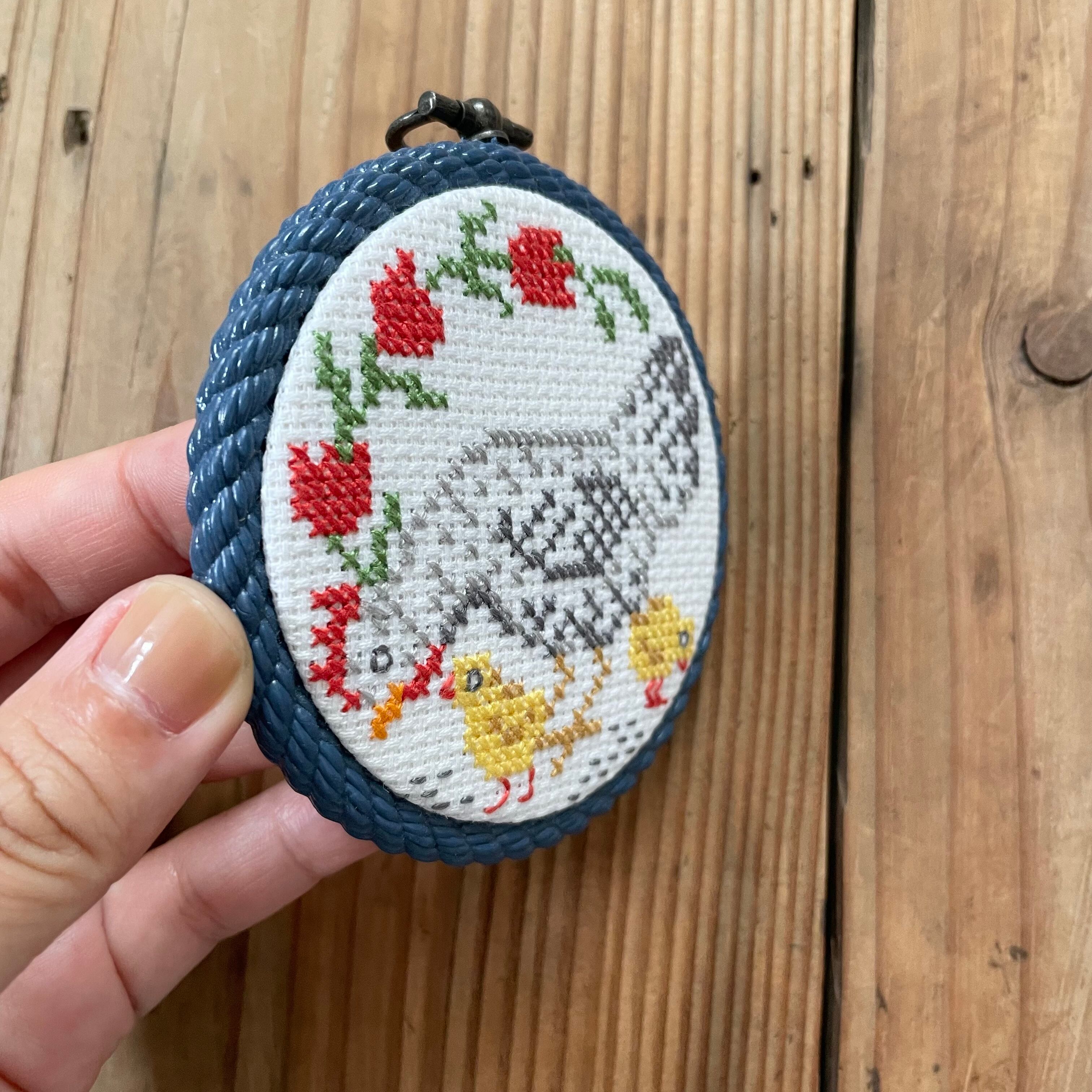 クロスステッチでニワトリとヒヨコが刺繍され、刺繍枠風の枠にはめこまれています。