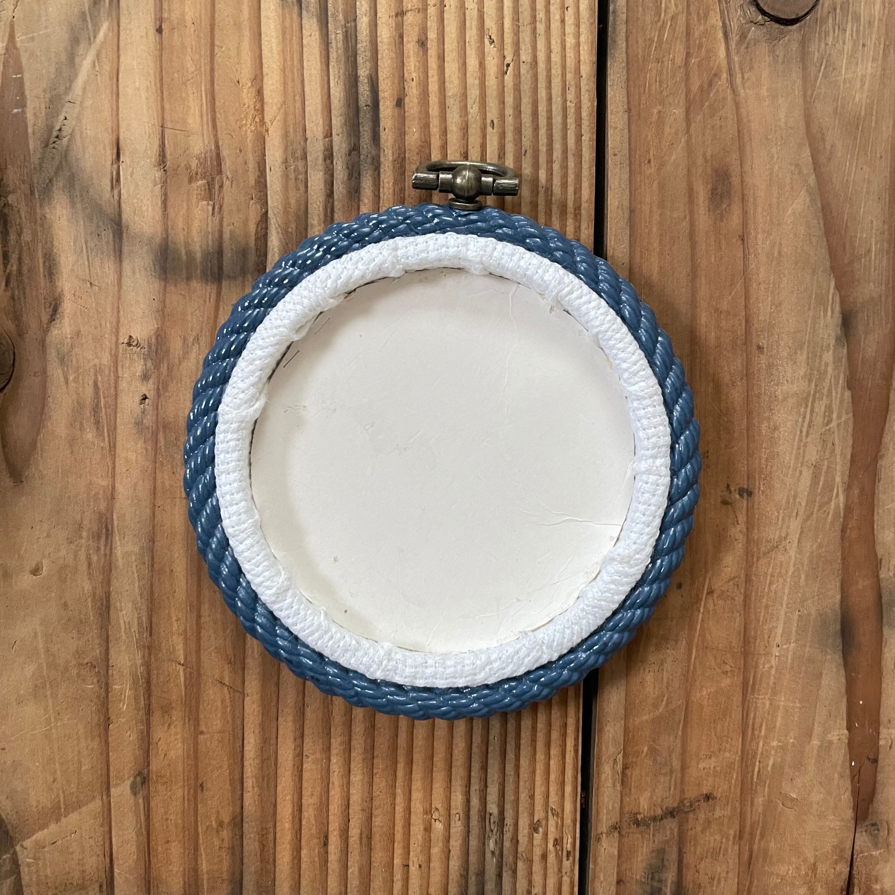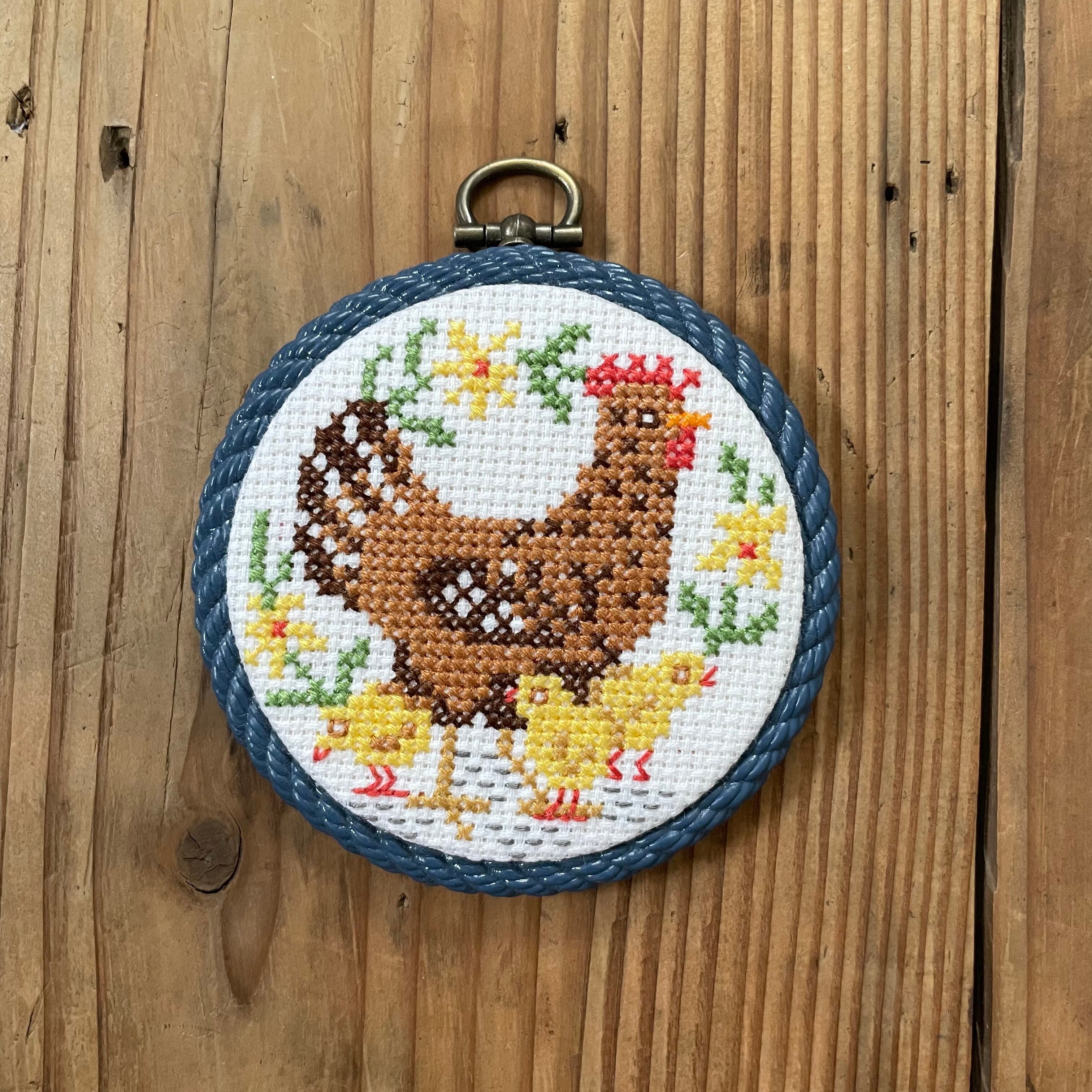 クロスステッチでニワトリとヒヨコが刺繍され、刺繍枠風の枠にはめこまれています。