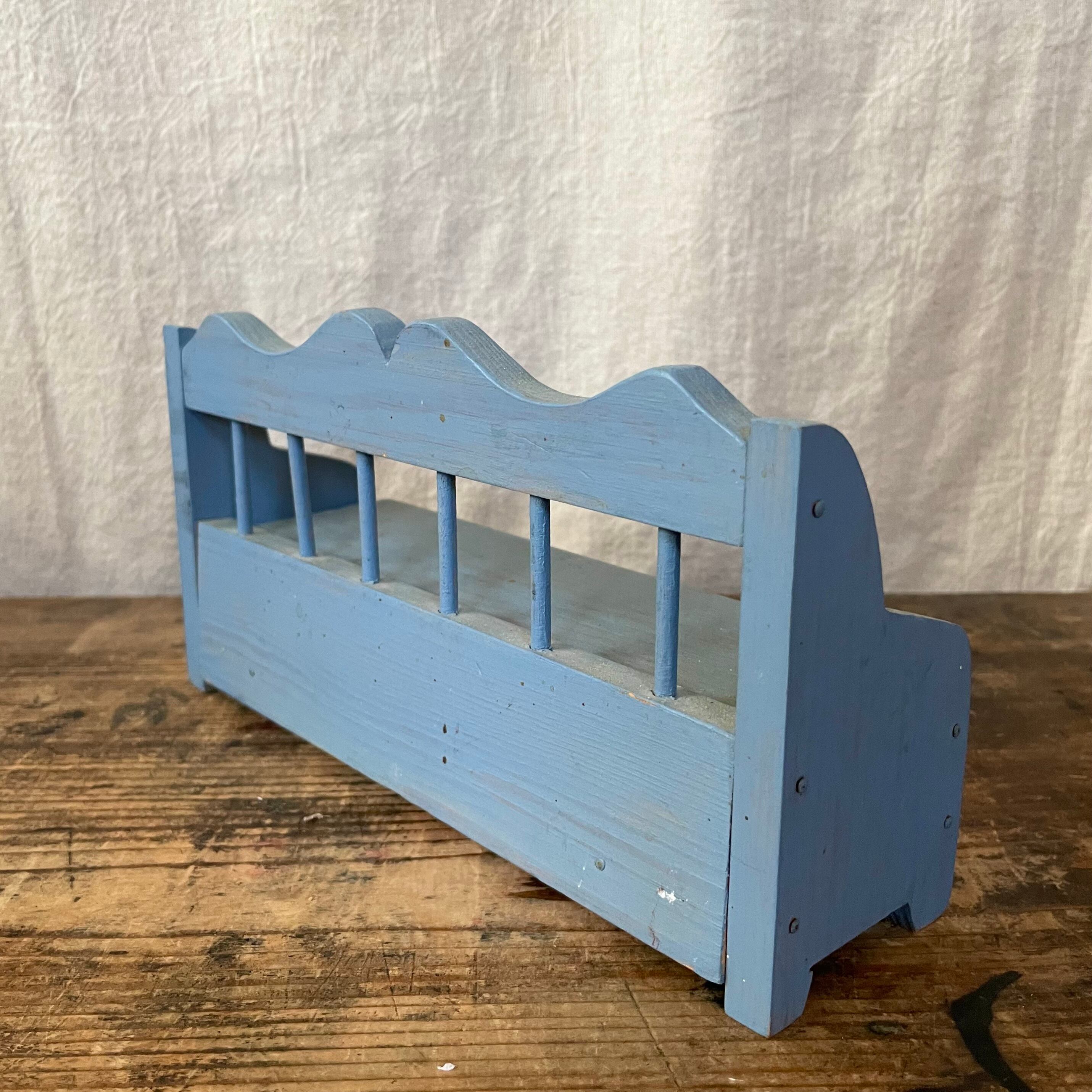 スモーキーなブルーに塗られたベンチは背もたれの形や描かれた花模様など、可愛い要素が散りばめられています。