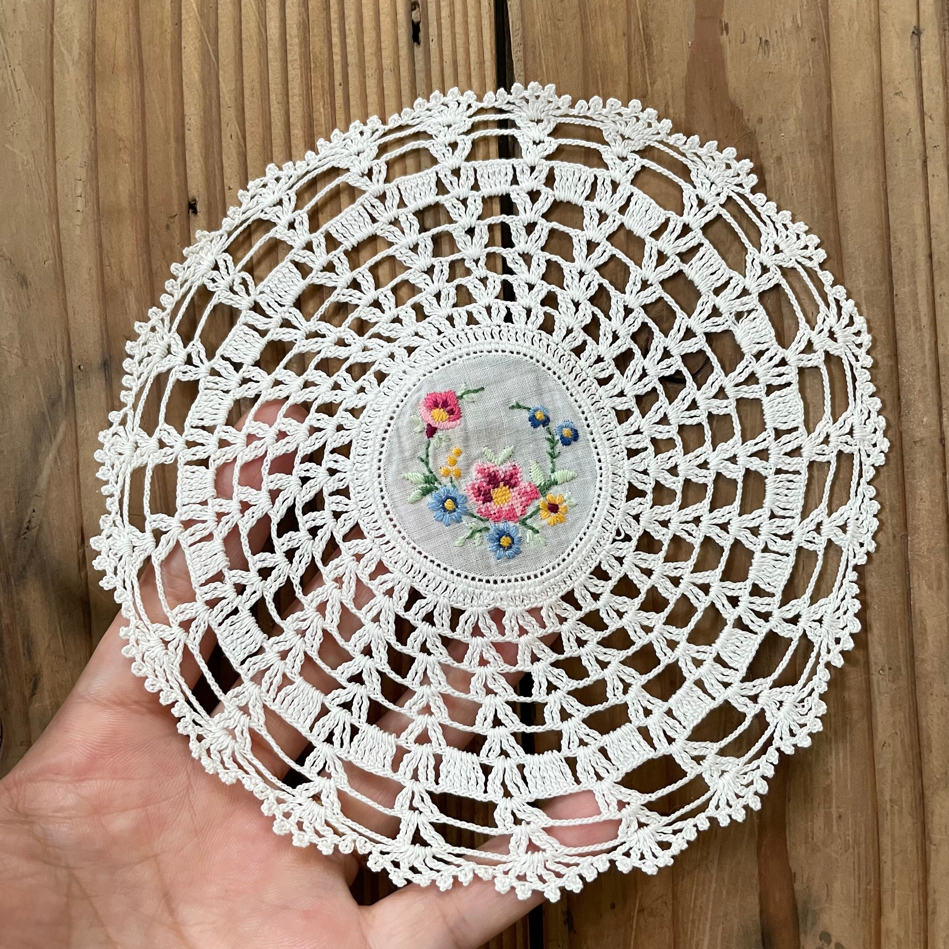 スウェーデンで見つけた真ん中に刺繍が施されたドイリーです。