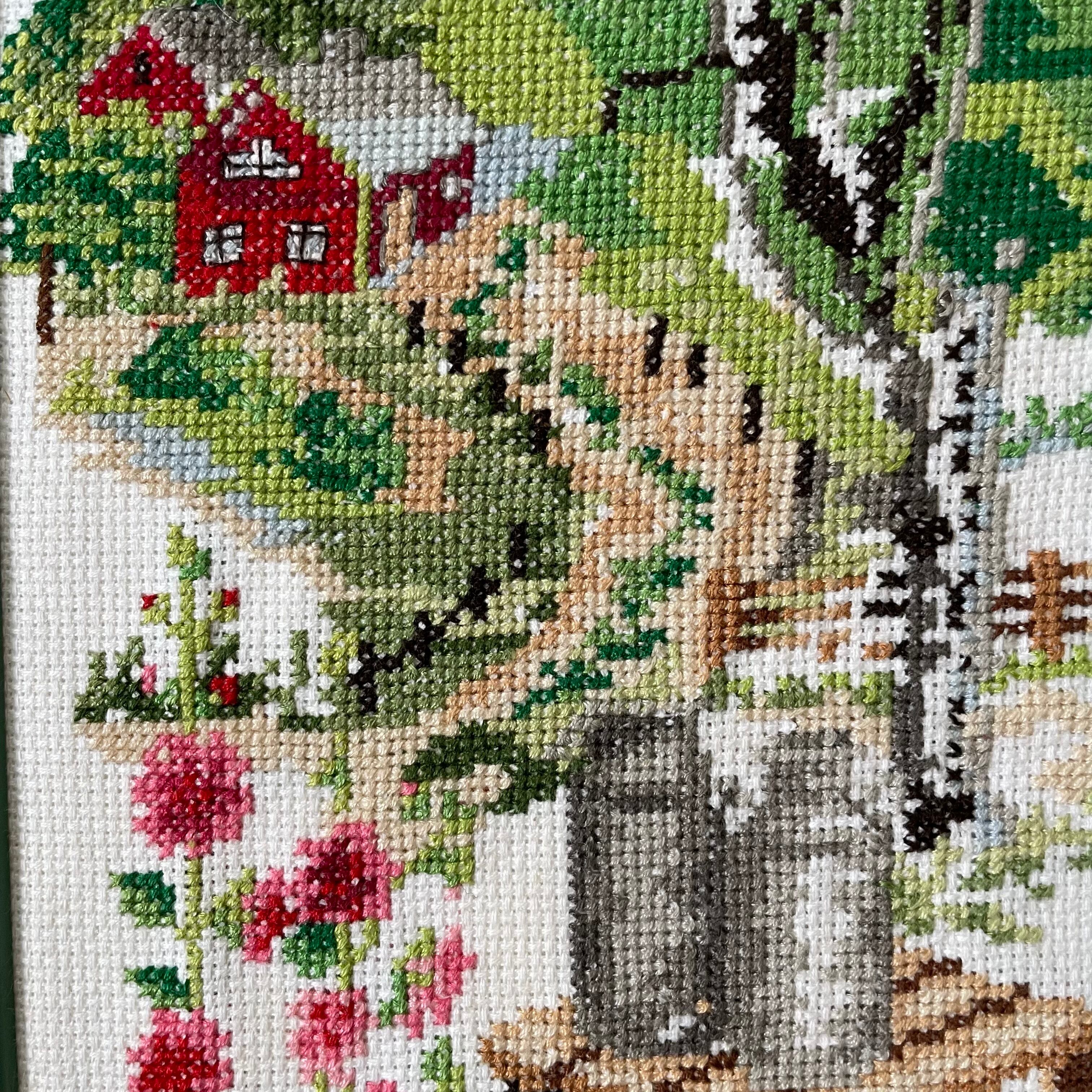 赤い建物とピンクの花の色がいいアクセントになり、素朴だけど華やかで明るい印象です。