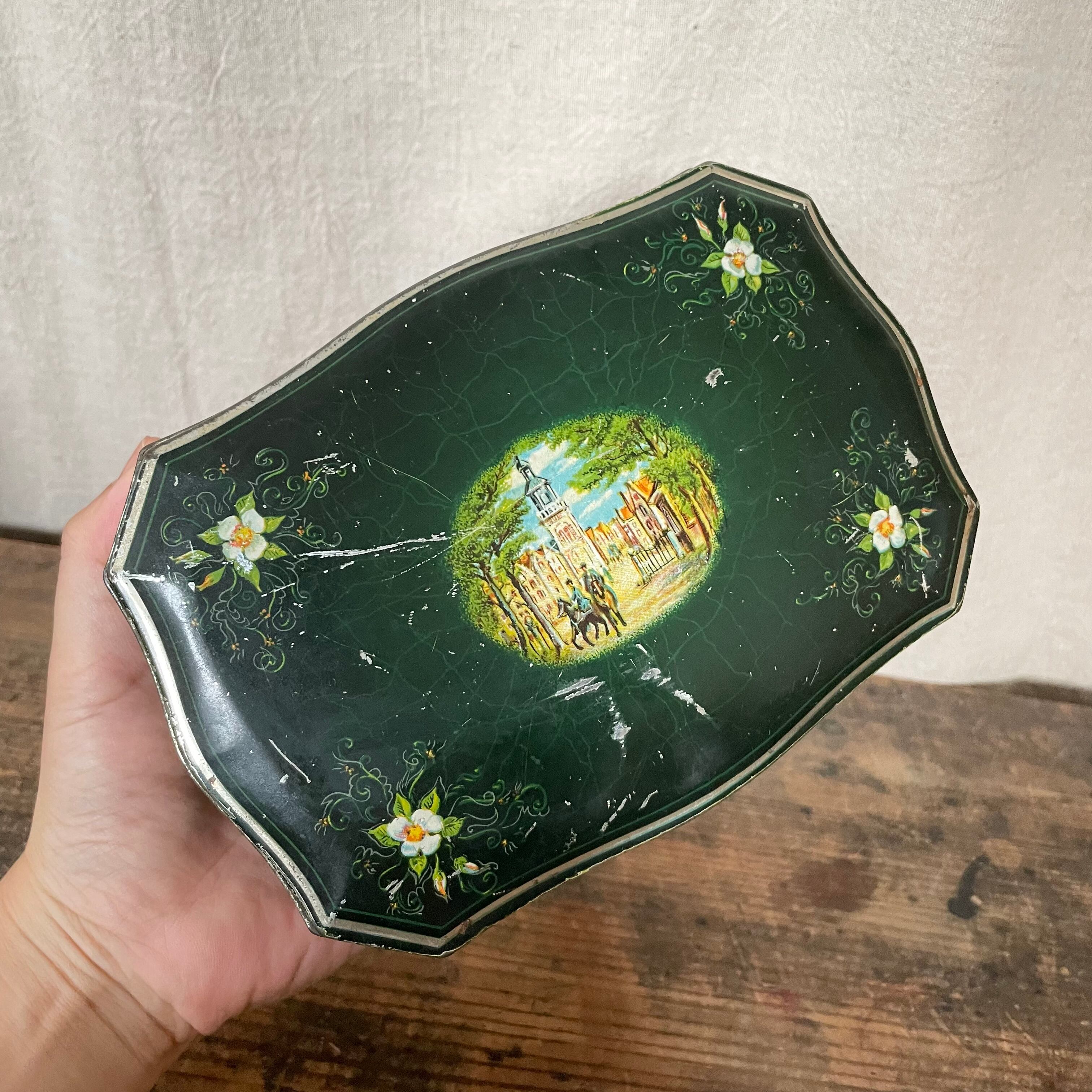 ふちの形が有機的で、底に脚がついている缶は、形はかわいらしいけど、色のベースが落ち着いた緑なので、全体的にエレガントな雰囲気があります。