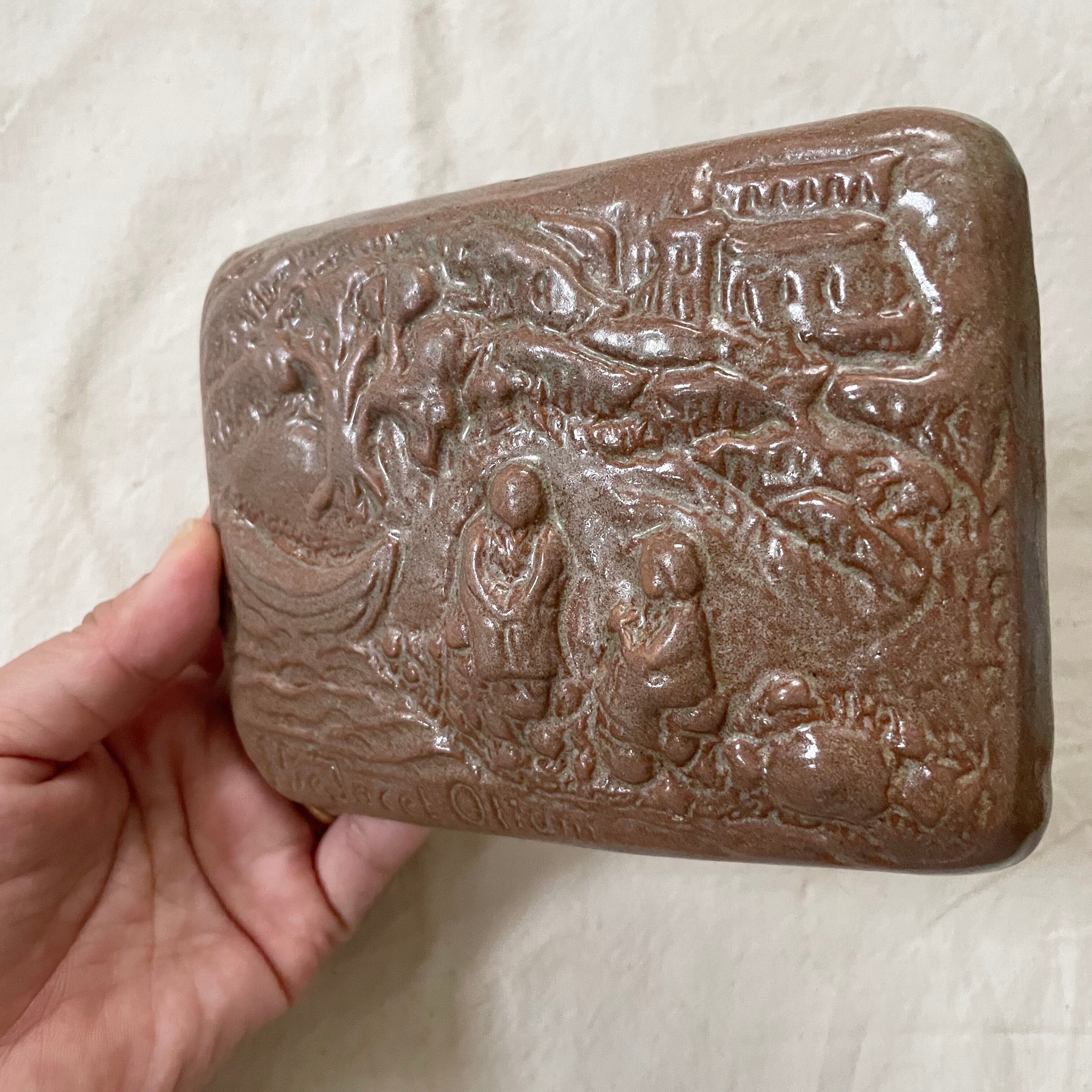 着彩がなく、立体感だけで表現された陶板は、建物や川や森に人などたくさんの要素がぎゅっと詰まった1枚になっています。