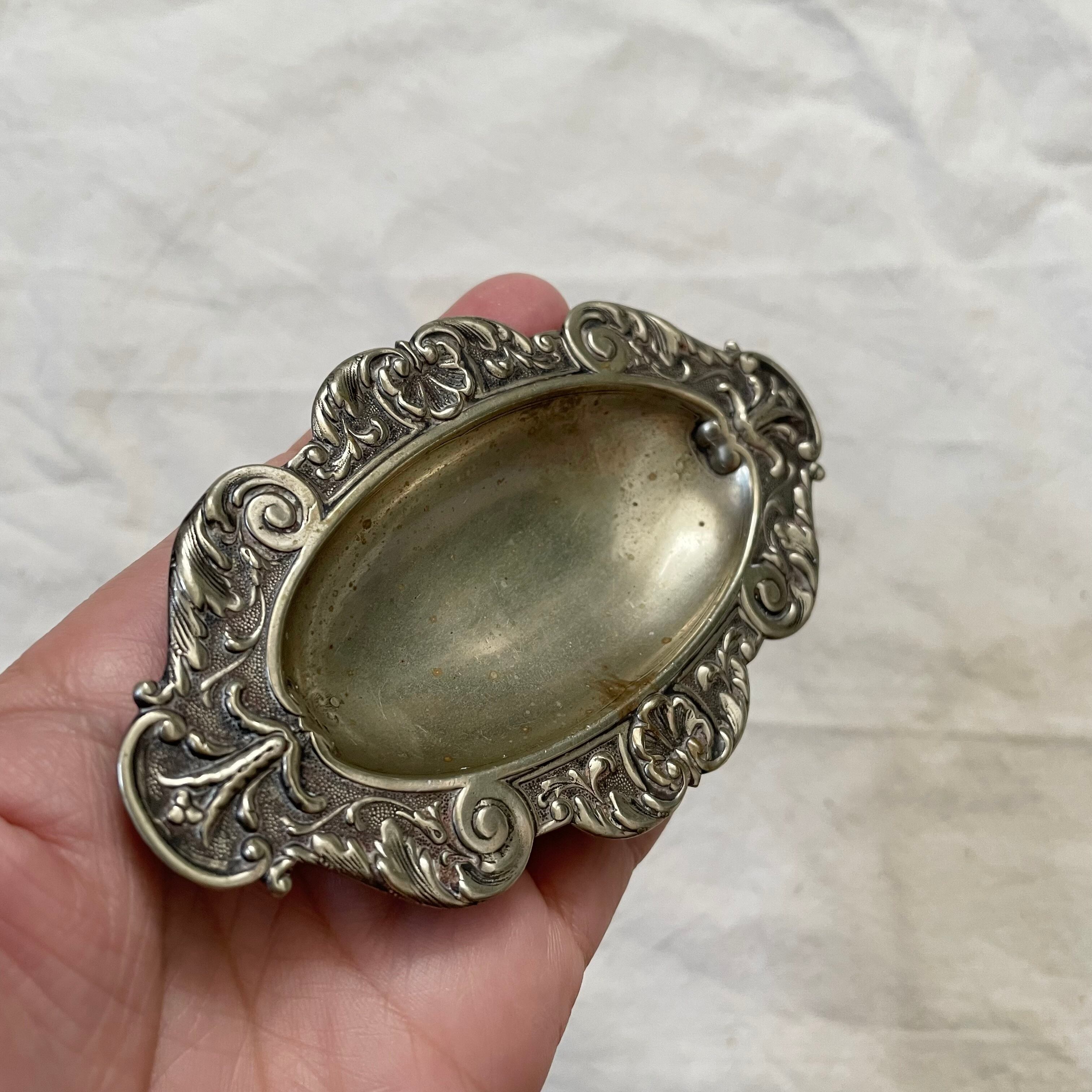シルバープレート製かな?少し黄みがかった銀色の小さなトレイは、小ささとふちの繊細さに一目ぼれして買い付けました。