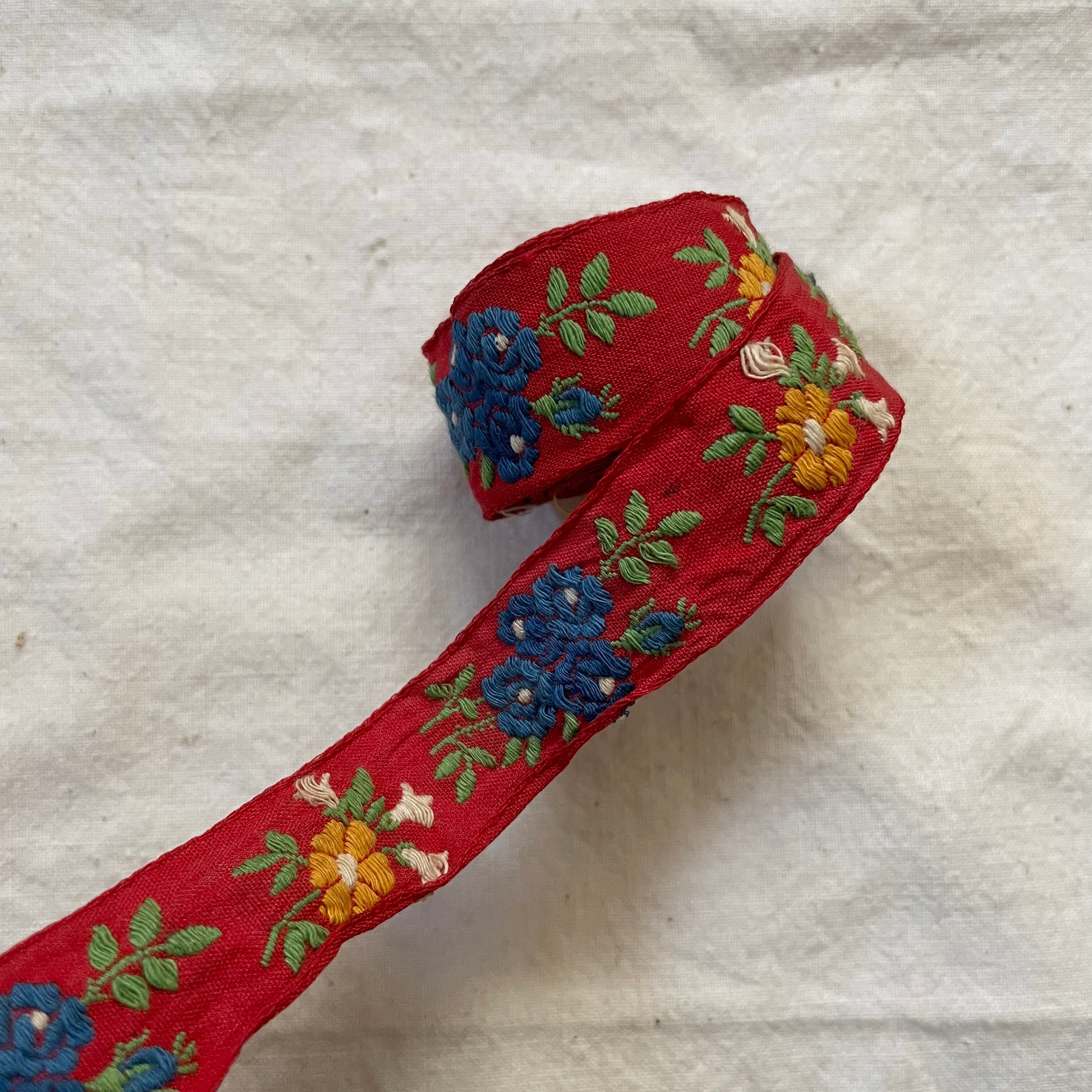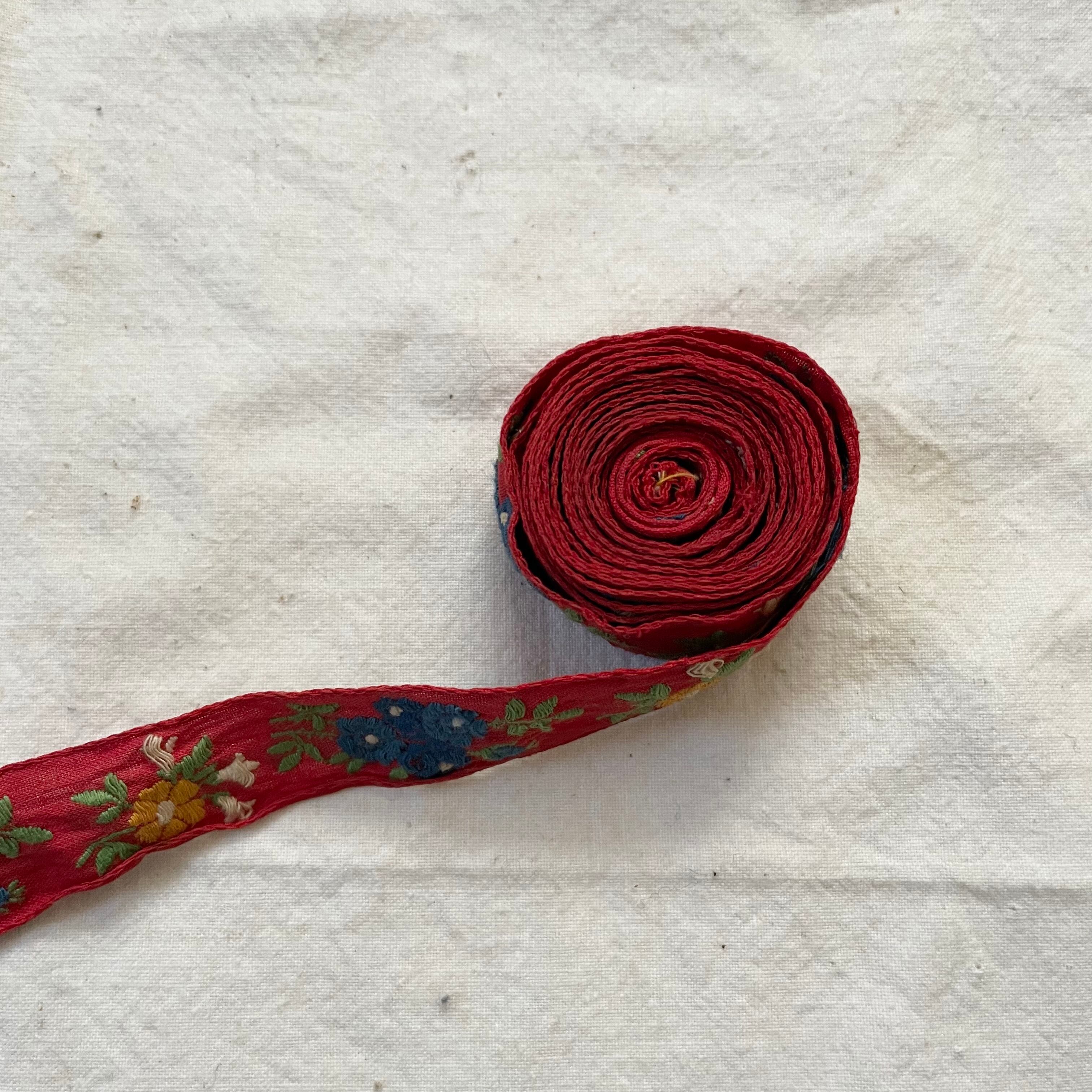 赤地に黄色と青の花模様の刺繍のリボンです。