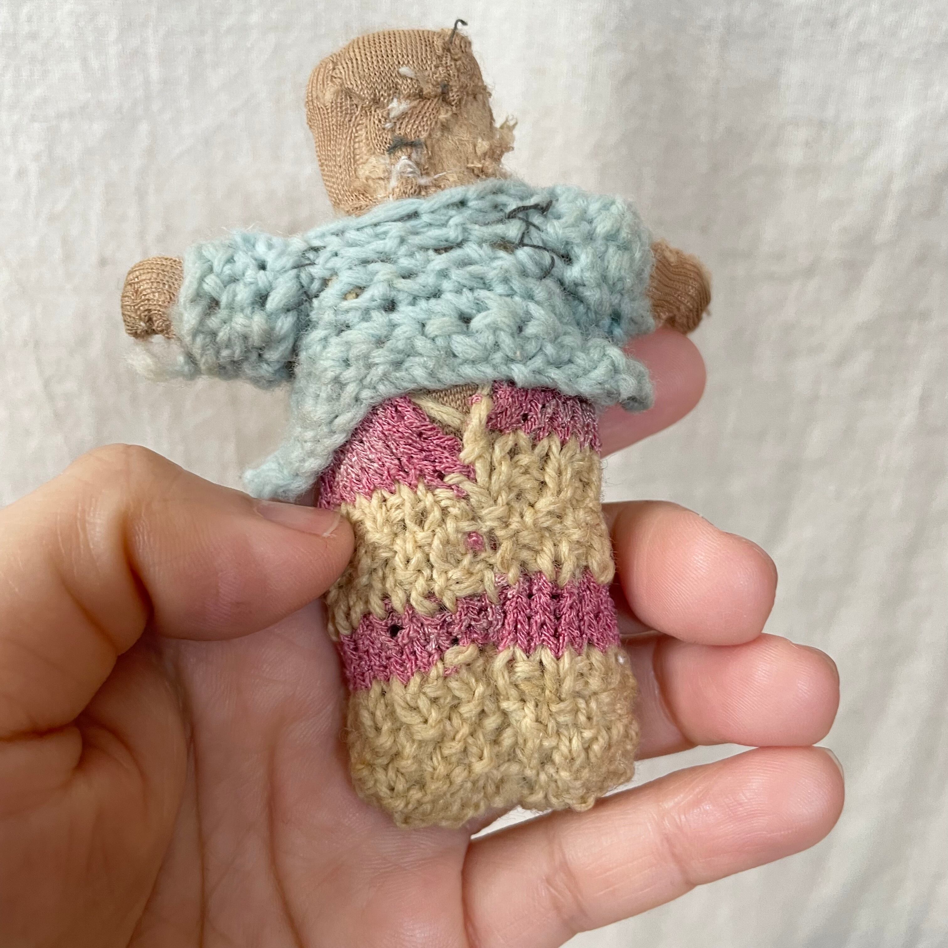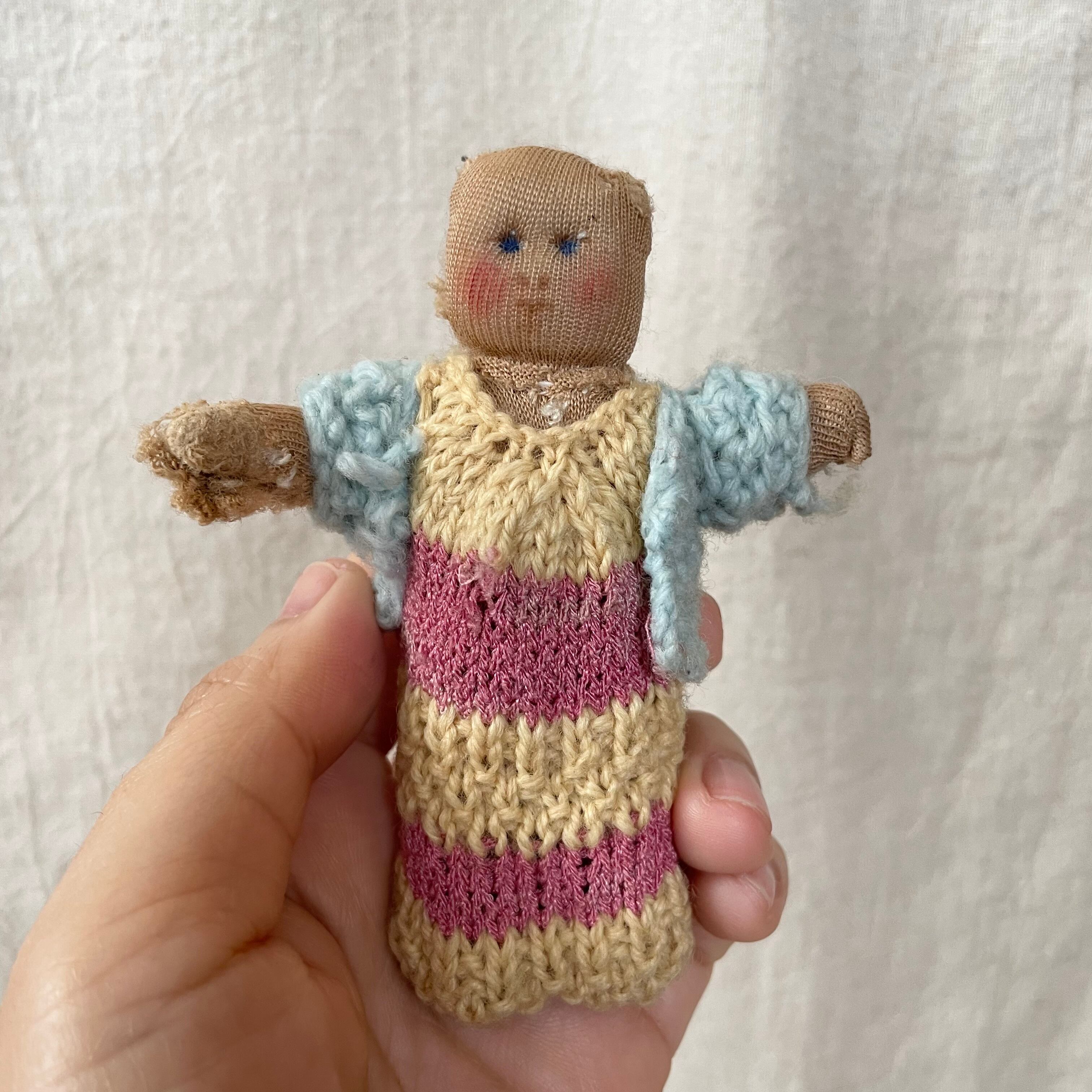 手作りで作られた人形で、ゆるい顔とかわいらしい服装に一目ぼれして買い付けました。