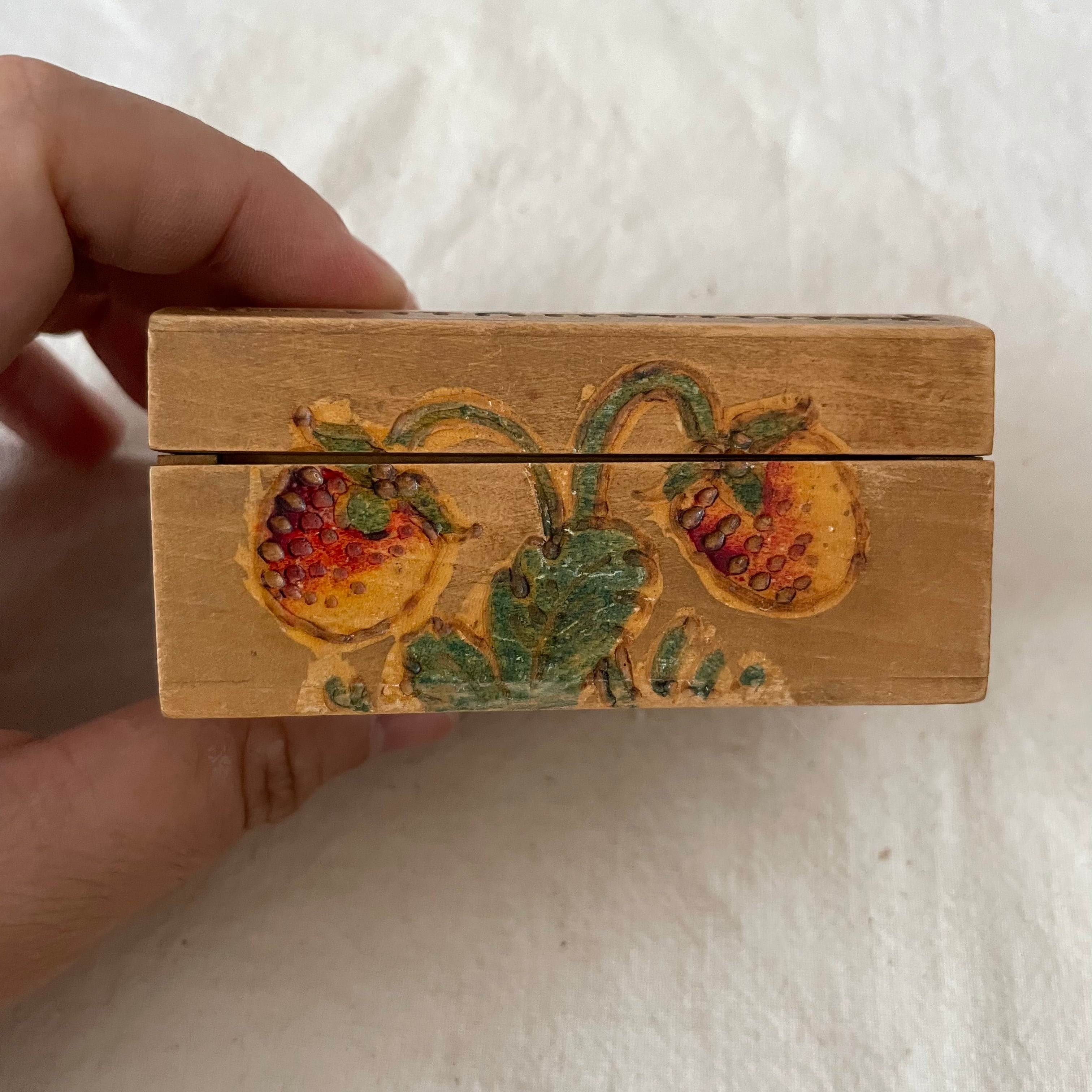 小さくて素朴な箱は、蓋部分に人のような模様、手前側面にイチゴのような模様が描かれています。