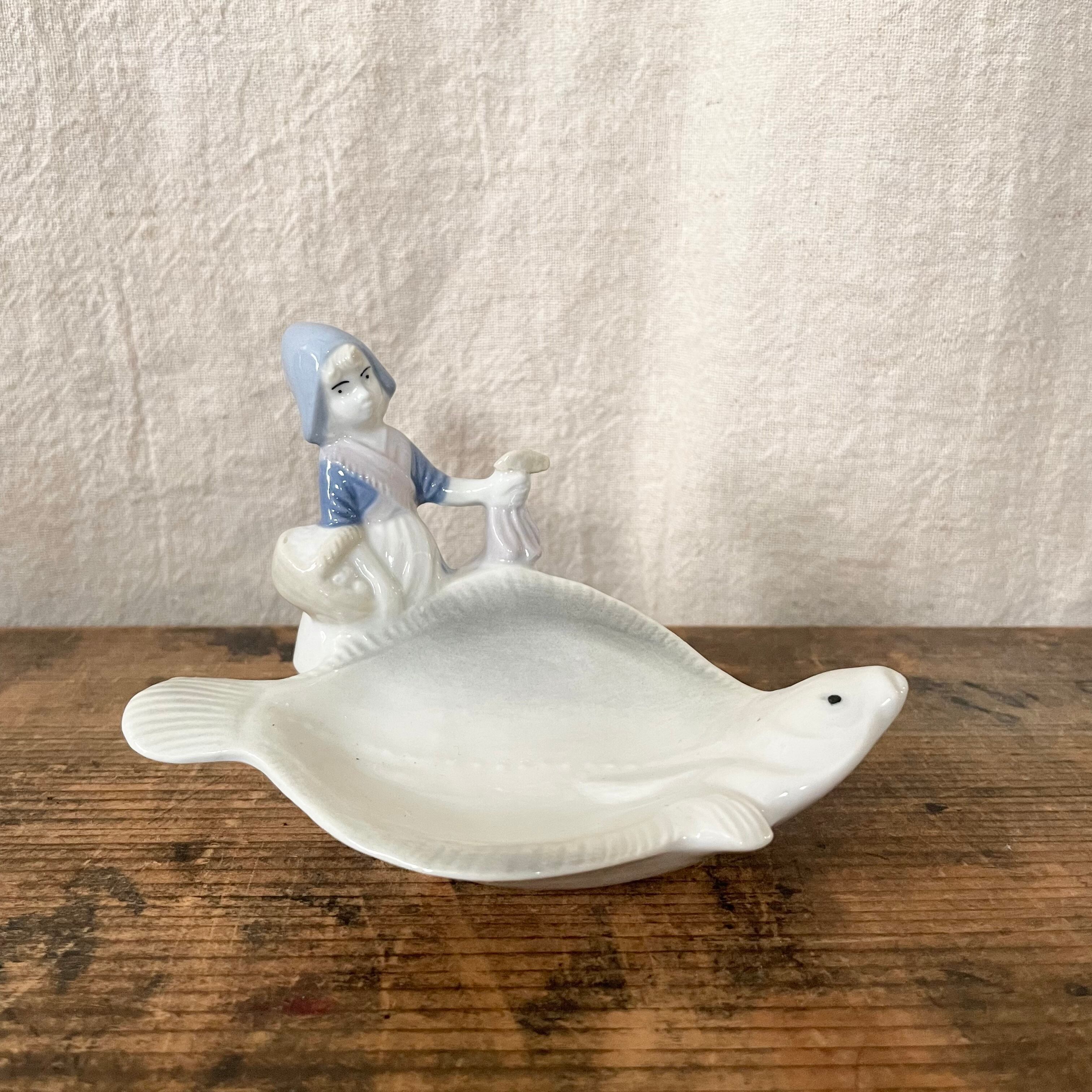 かごと傘をもったレディと、大きなヒラメのような魚のトレイがくっついています。