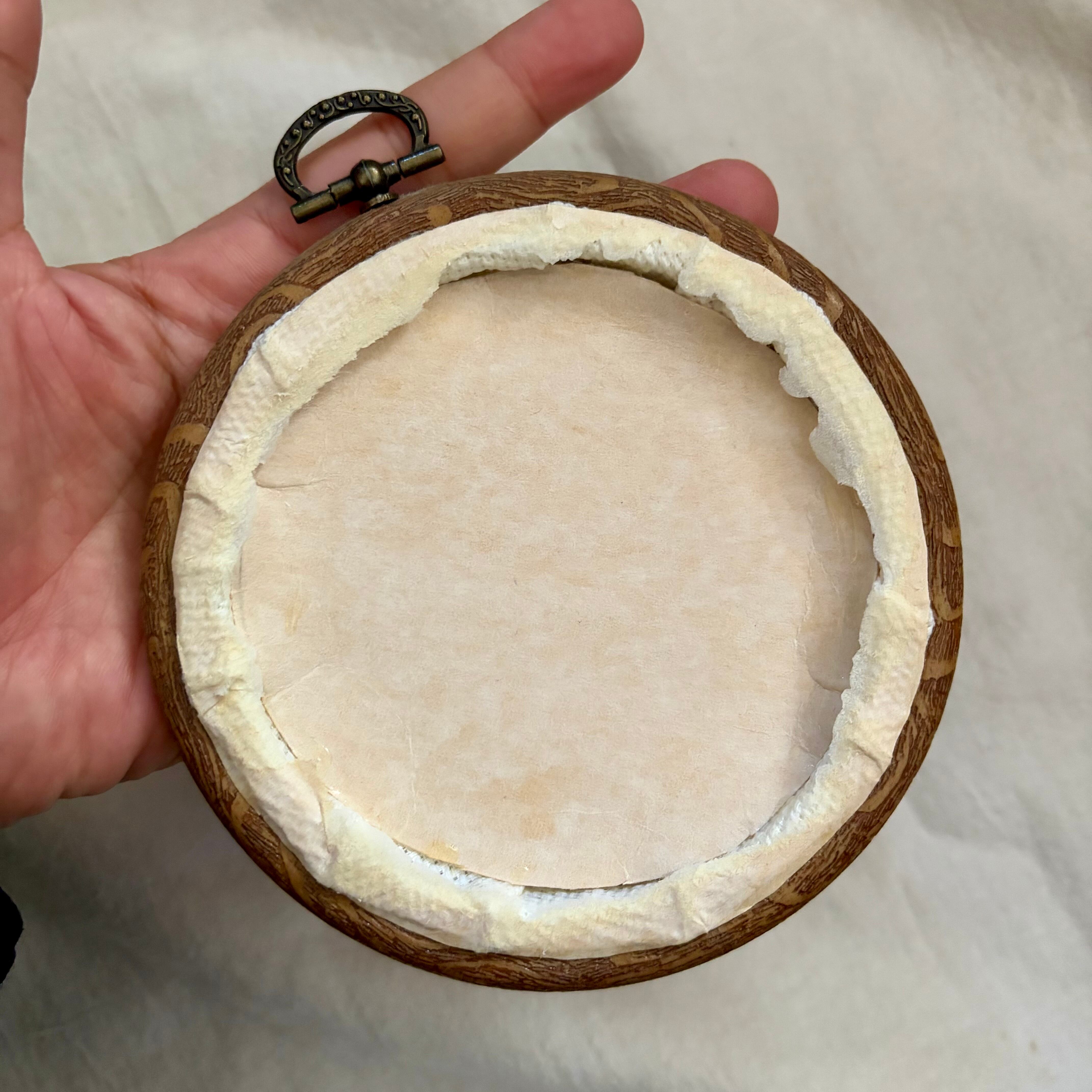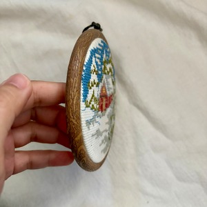 刺繍枠なのかな?木を模したゴム製のフレームも雰囲気が合っていて、壁にちょこんと飾りたくなります。
