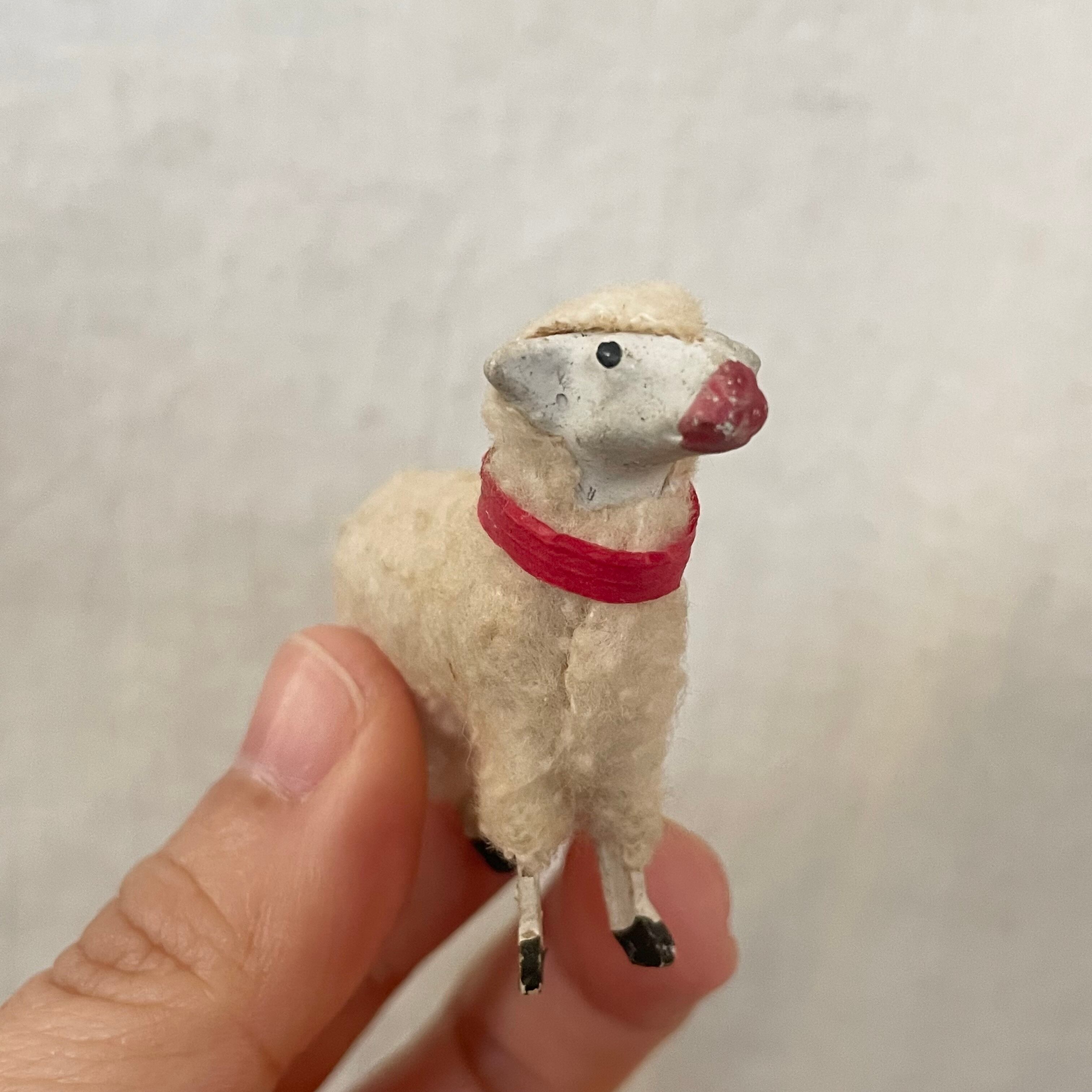 顔と体は石膏製、胴体にはウールが巻かれていて、足は木製、首のリボンは紙製です。