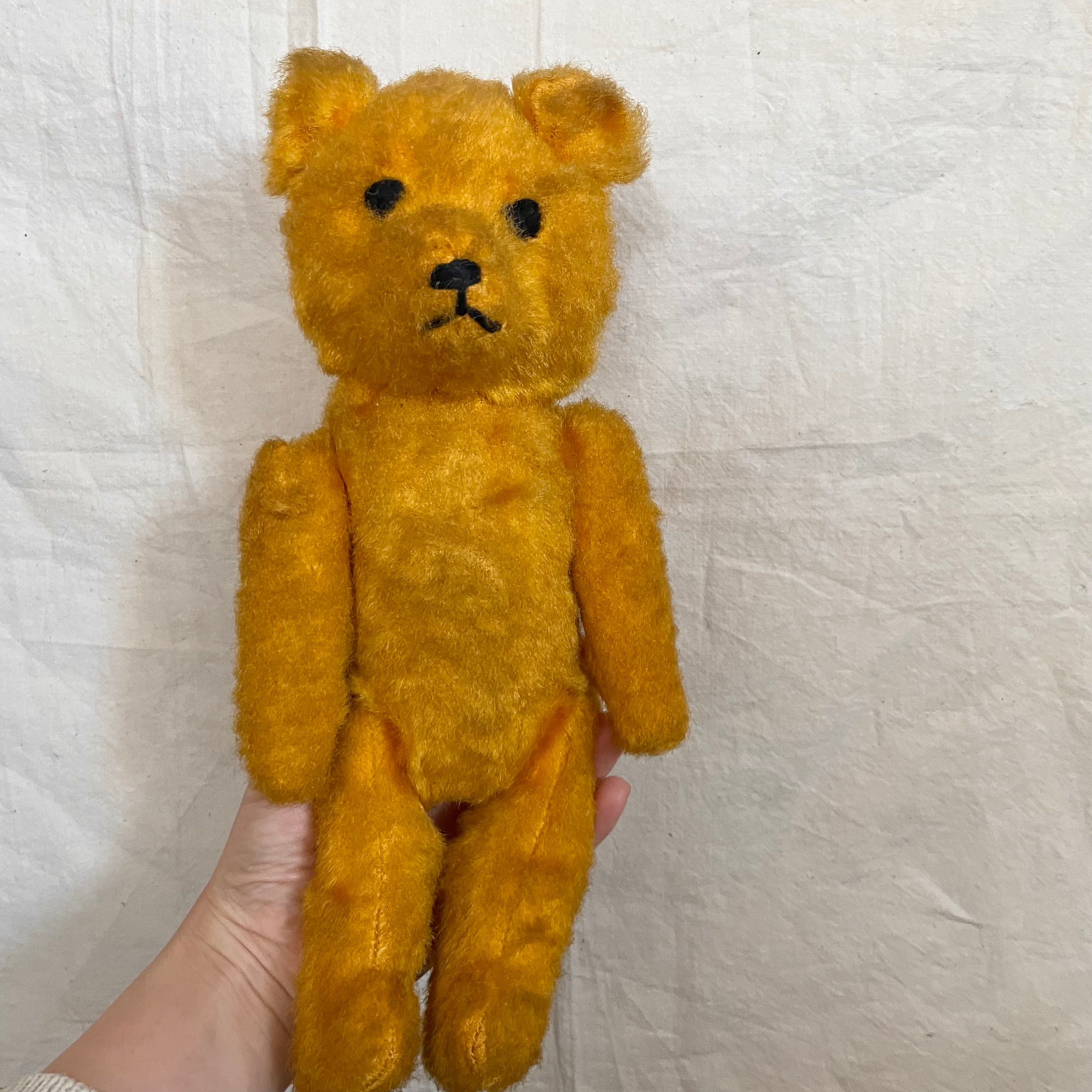 少しくすんだ黄色のクマさんは、縫われた目鼻口が特徴的です。