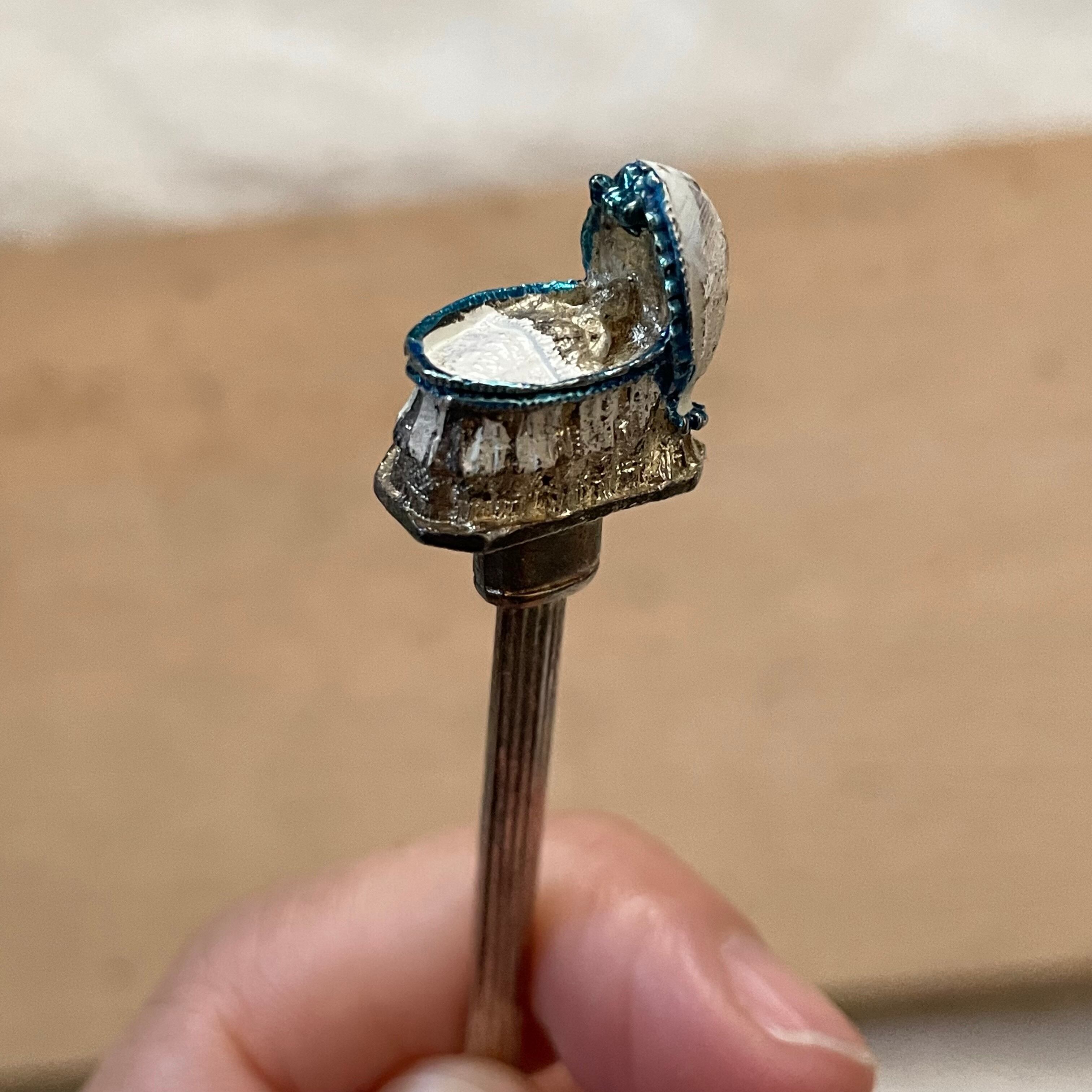 少し剥げていますが、青と白の可愛らしいベッドには人が横たわっています。