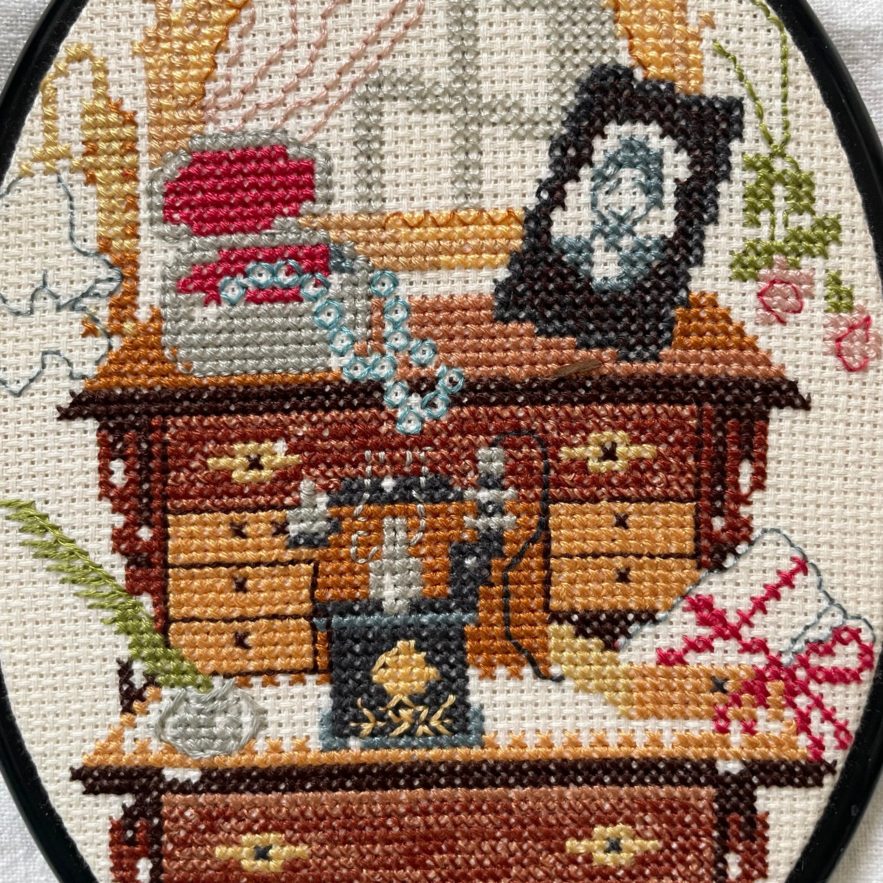 黒いゴム製の枠に、華やかなドレッサーの模様がクロスステッチで表現されています。