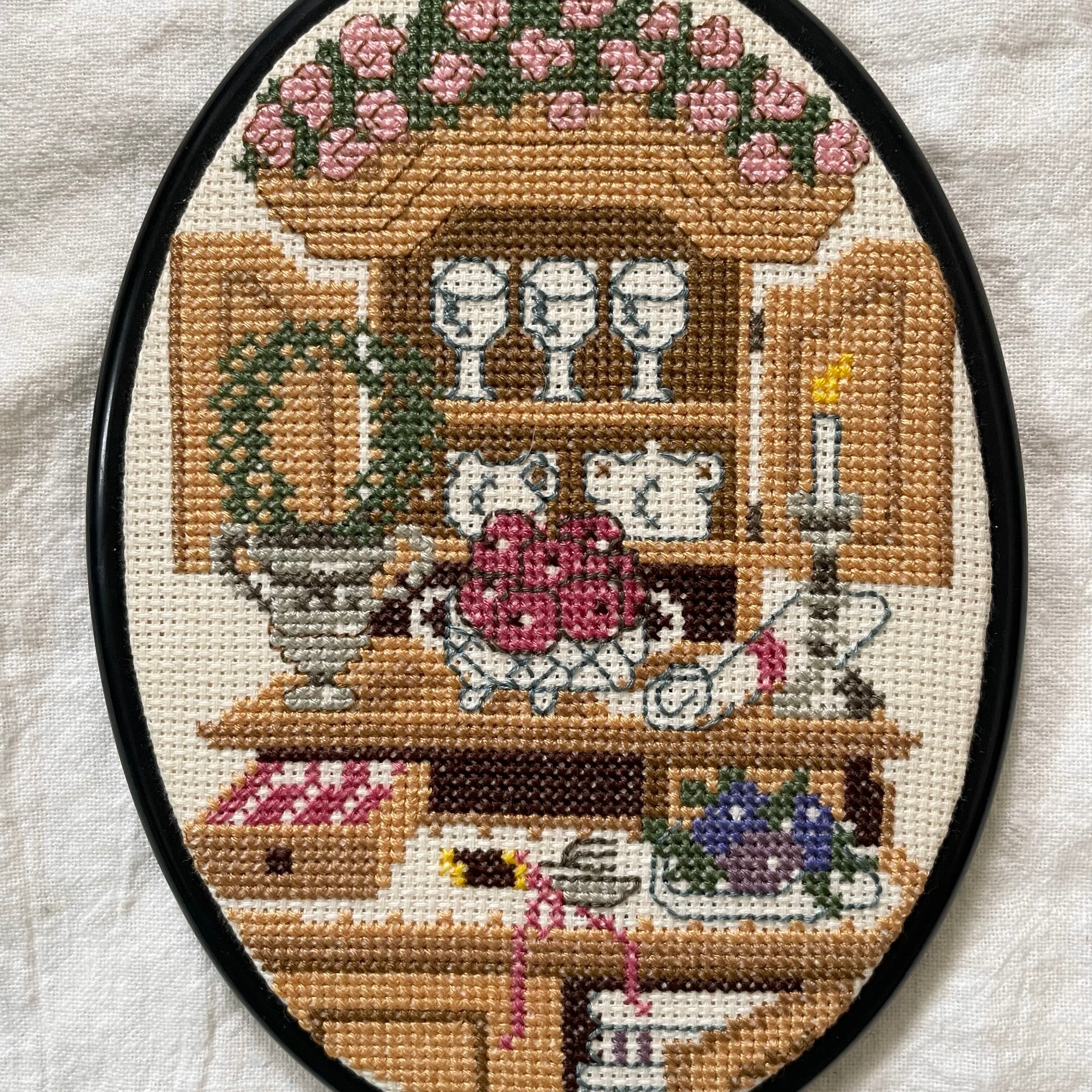 黒いゴム製の枠に、華やかな食器棚の模様がクロスステッチで表現されています。