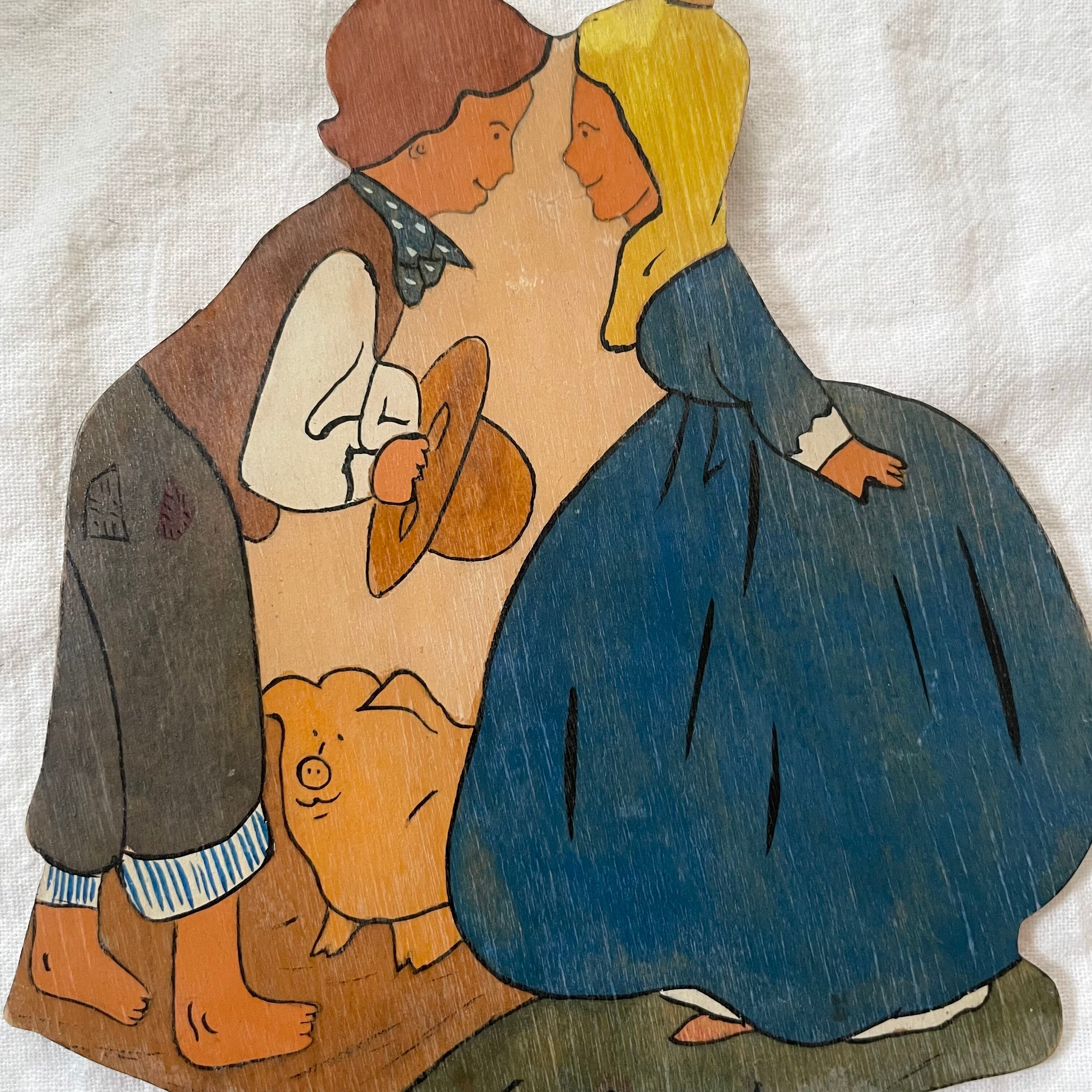 今にもキスをしそうな男女と、足元にどんな感情なのか全く読み取れないブタという、なかなかシュールな構図の壁飾りです。