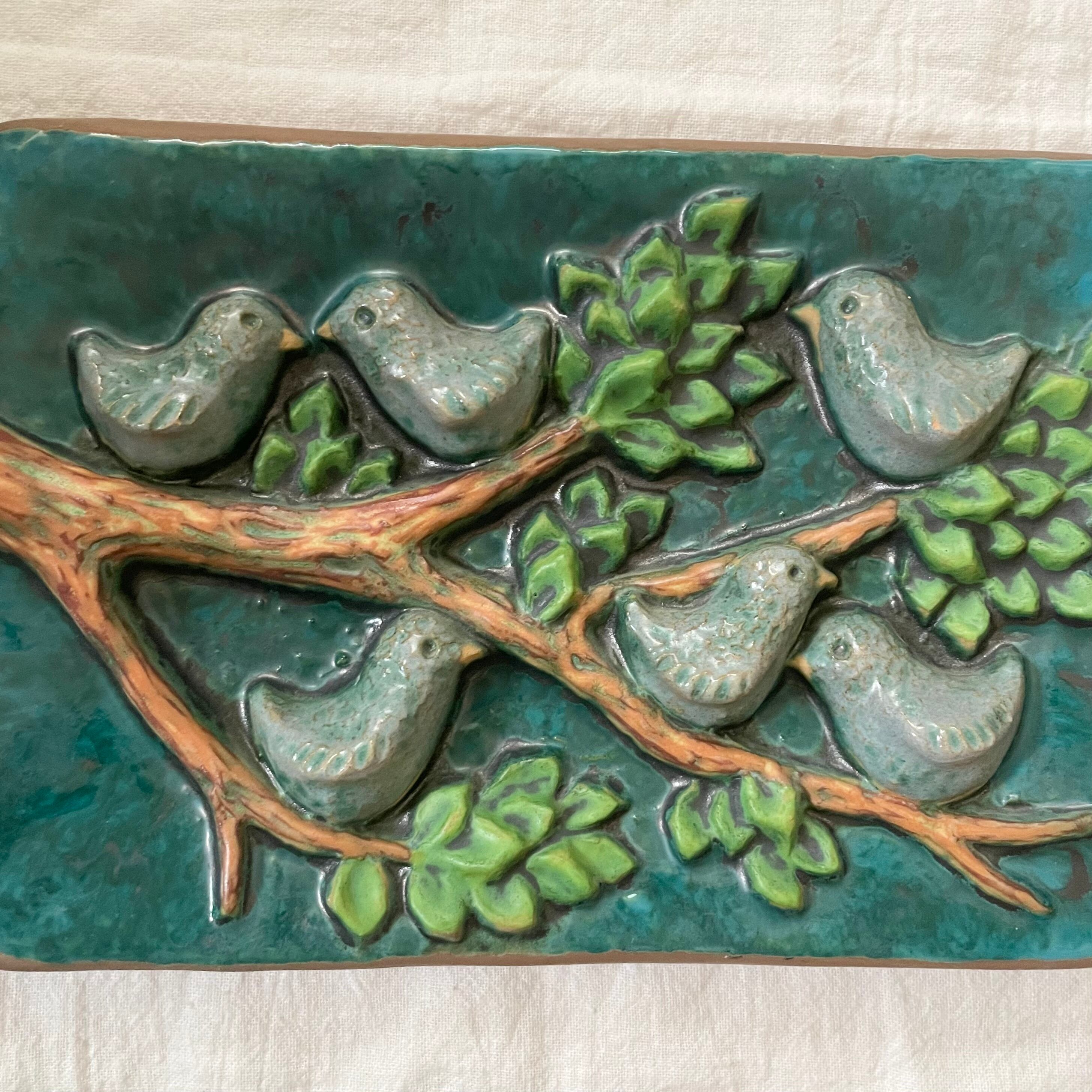 この陶板は地がへこんでいて、そこに立体的な木や鳥を配置することで、奥行き感と立体感がすごくよく感じられる秀逸な作品なんです。