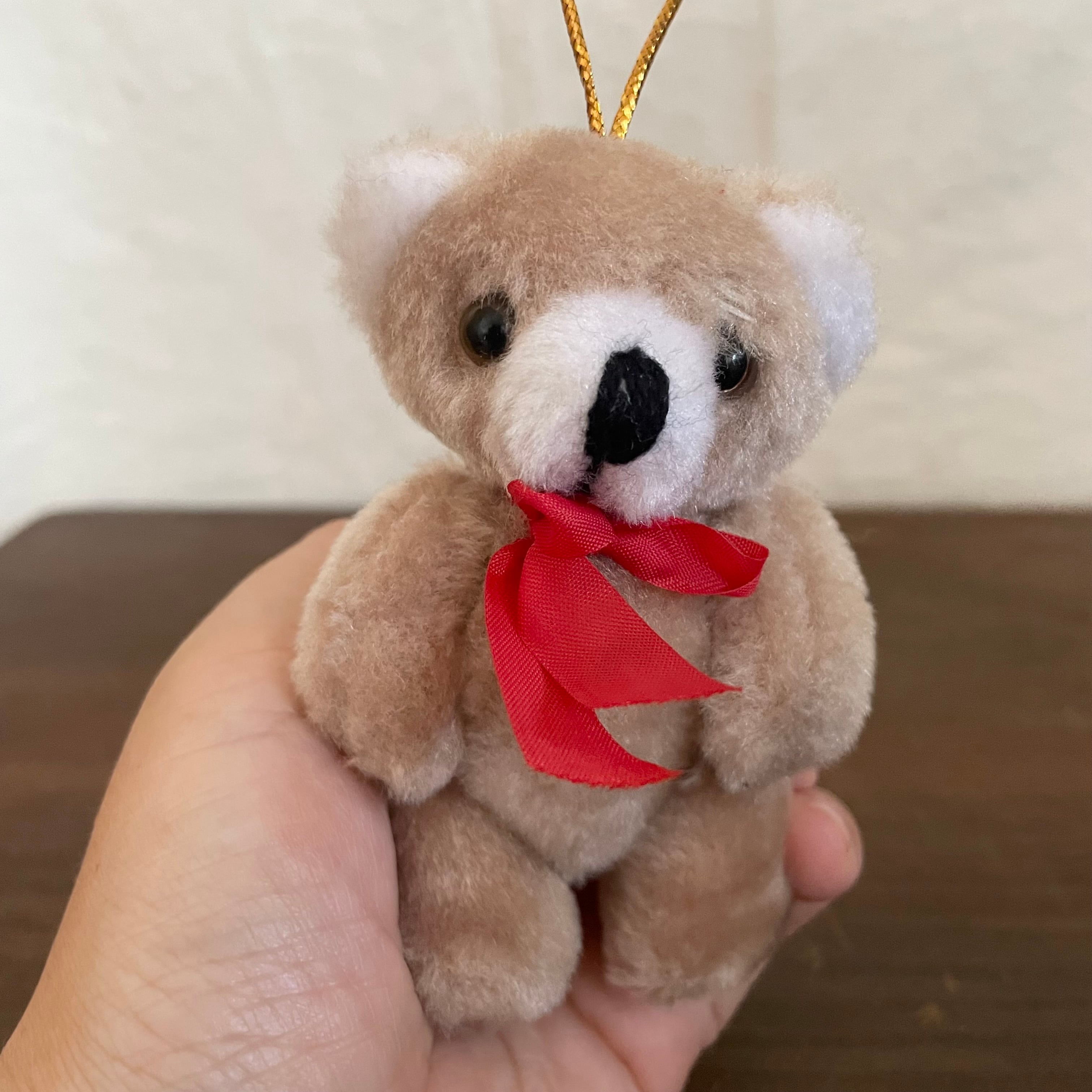 優し色味のくまさんは、赤いリボンが特徴的。上部にひもがついているので、壁に飾ることができますし、手足が動くので座らせることができます。