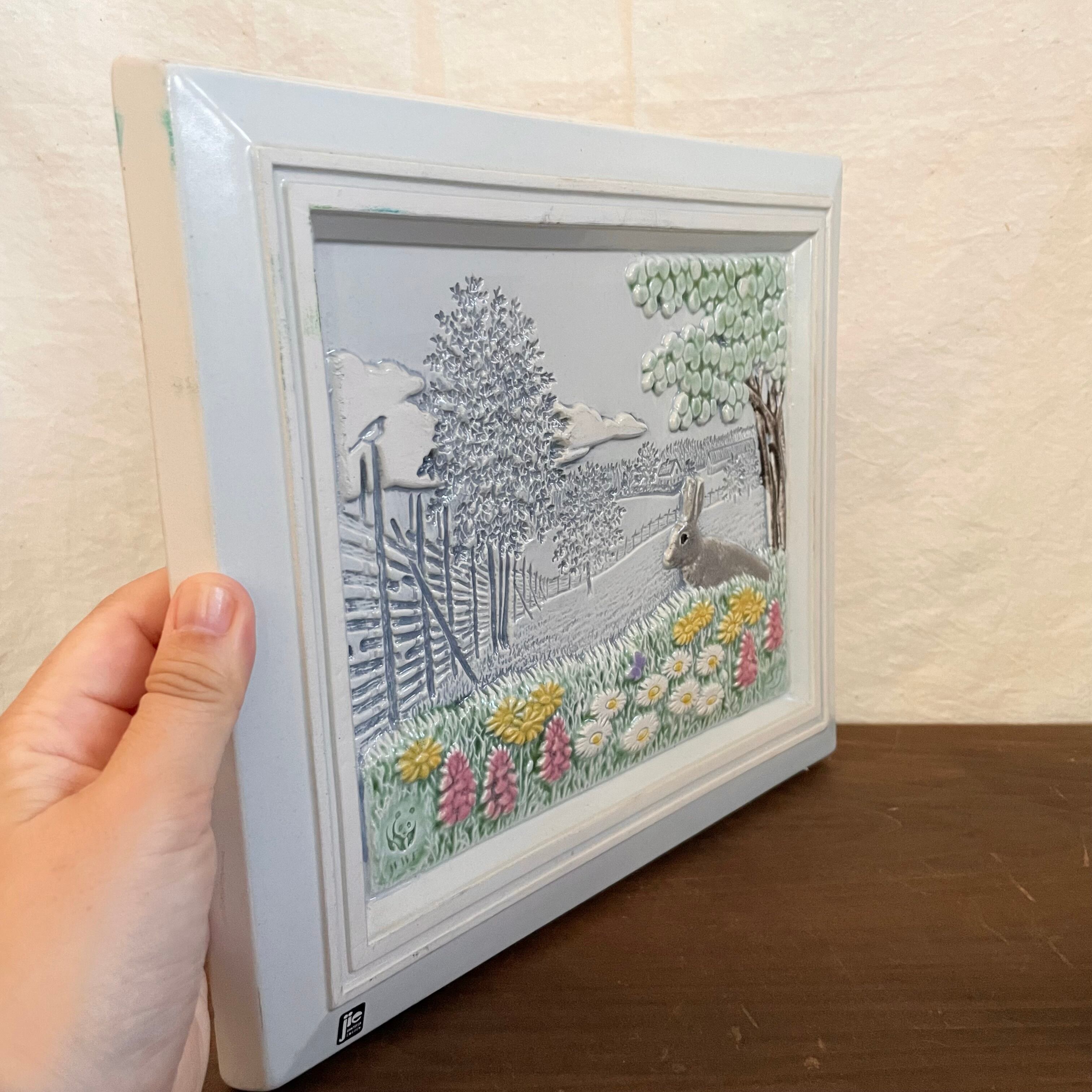 華やかな花たちが咲き乱れる中にちょこんといるウサギ、その後ろには素朴な風景画広がっています。