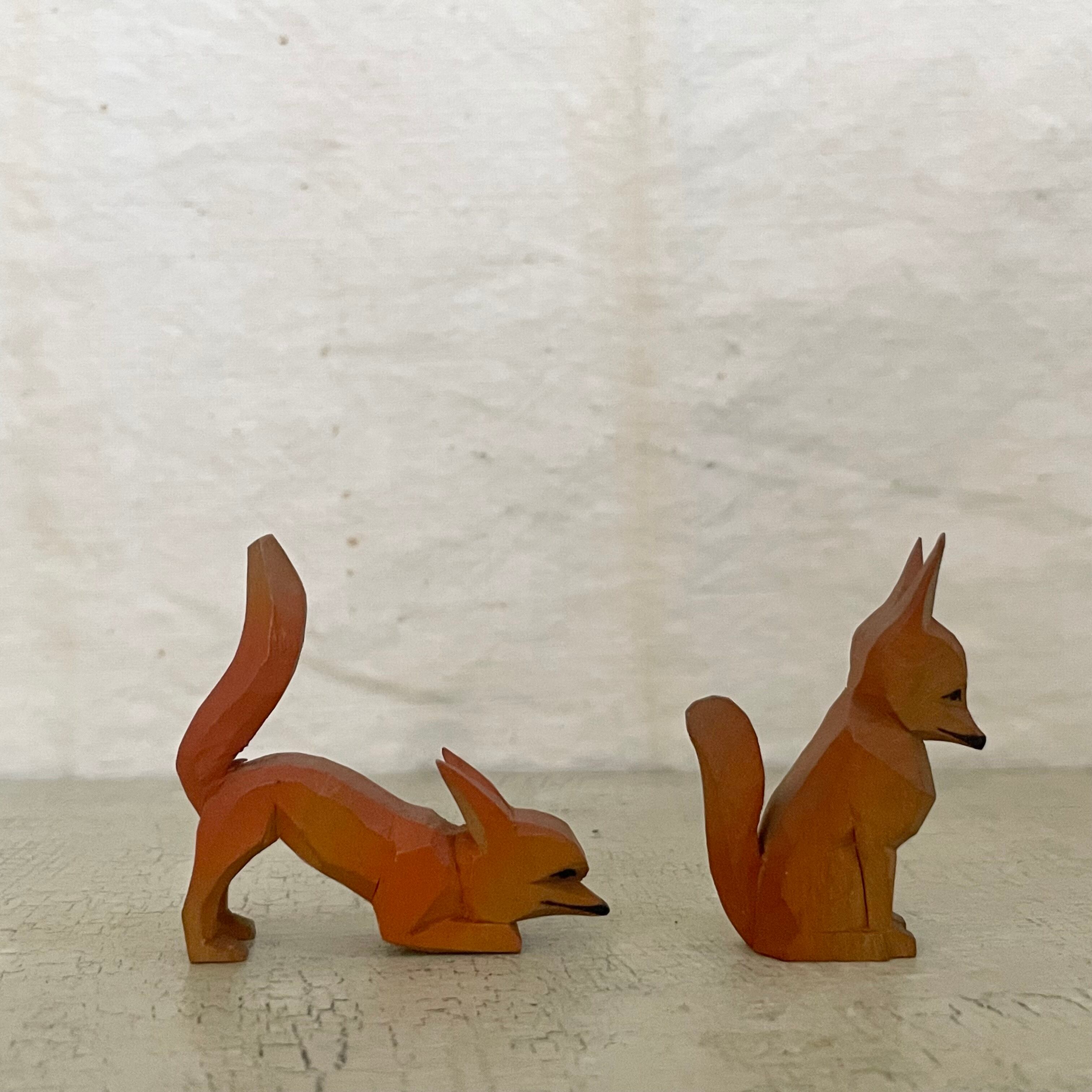 伏せをしてしっぽを立てて遊びたそうな子と、しっかりマテの姿勢でお座りをしている子という性格が全然違いそうなキツネたちです。