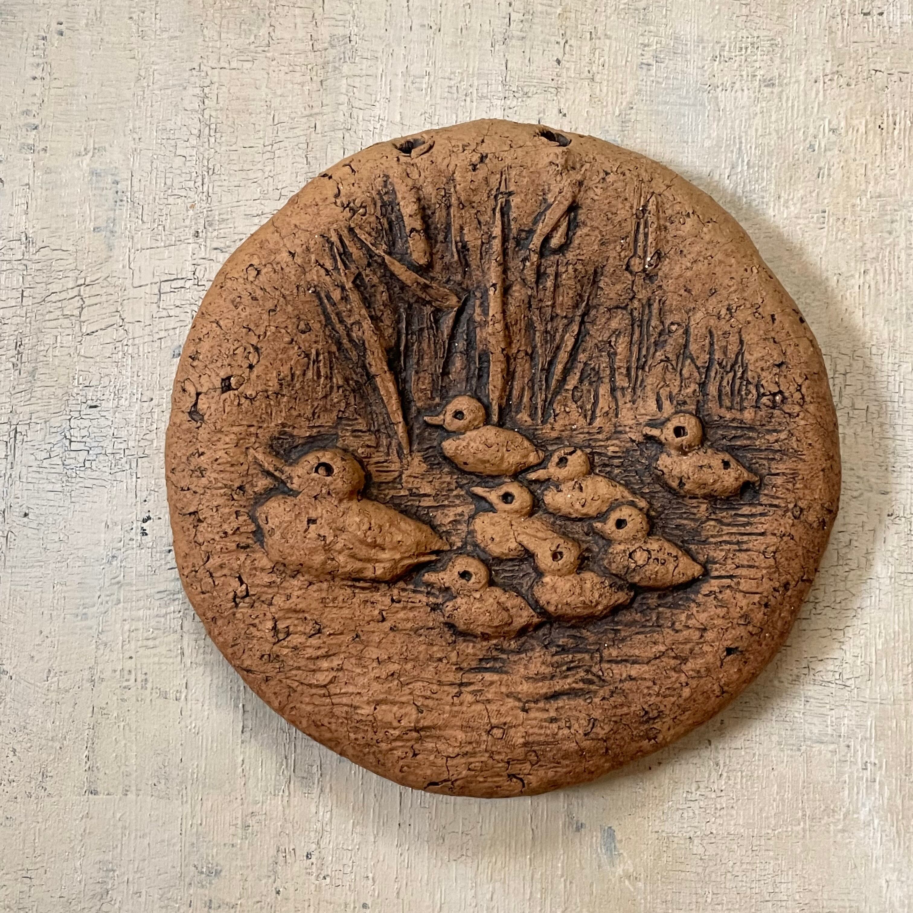 素地の茶色に立体感のある鳥の親子が表現されています。