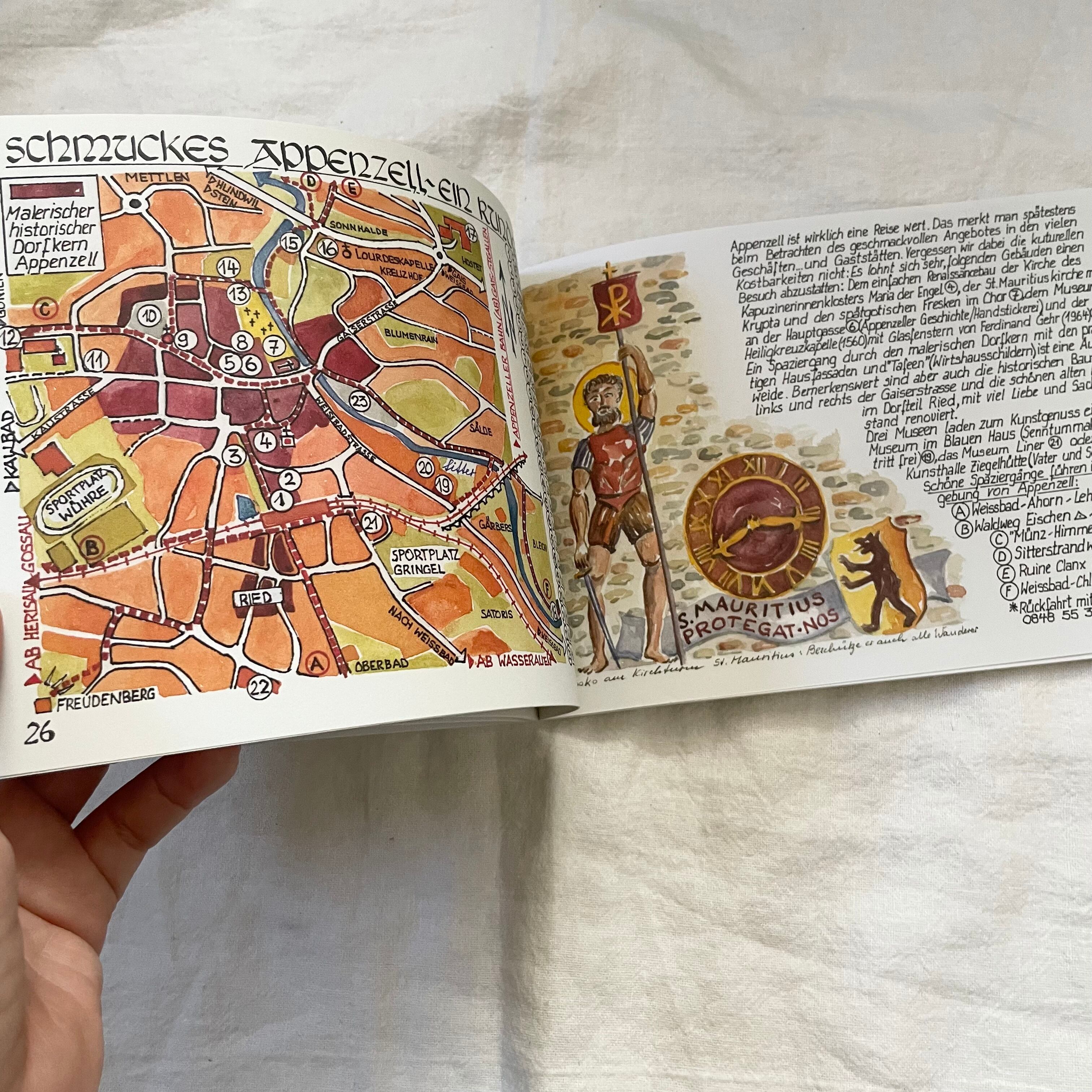 手描きのような独特の文字と地図、美しい水彩画のイラストがページいっぱいに広がっていて、1ページの情報量がすごく多い気がします。